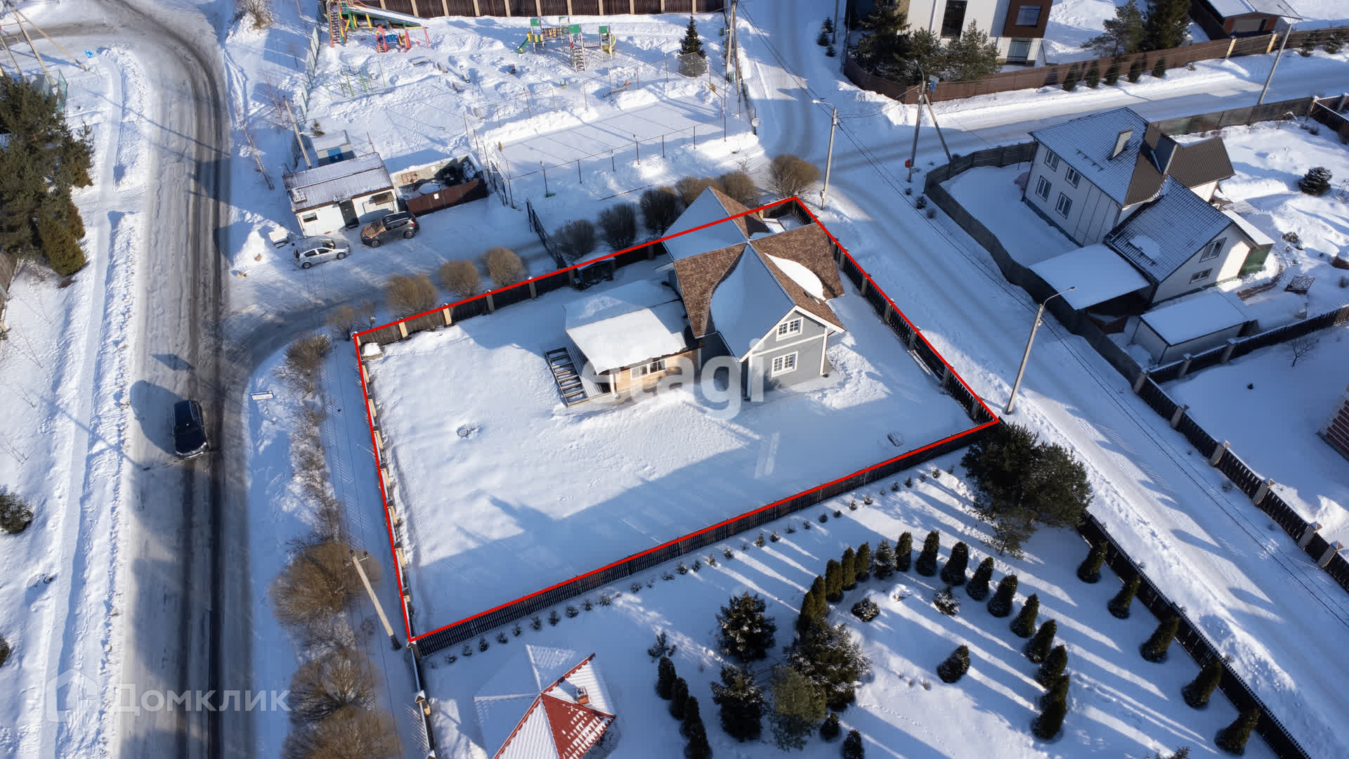 Участок огорожен капитальным забором. Хорошее простаранство на оставшемся участке земли .