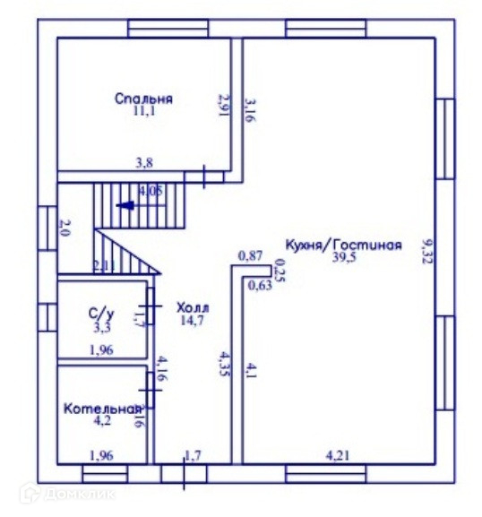 Бетонная лестница с дубовыми ступенями и увеличенные окна 1800х1800. На первом этаже находится гостиная, объединенная со столовой и с выходом на террасу, спальня, а также технические помещения. В доме всего 4 спальни.