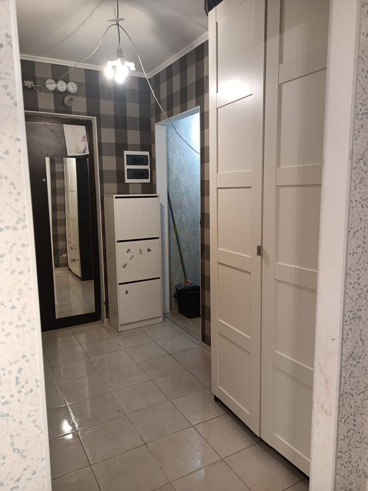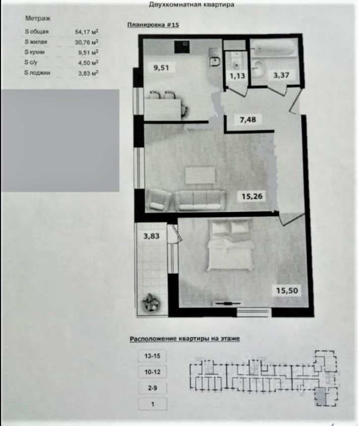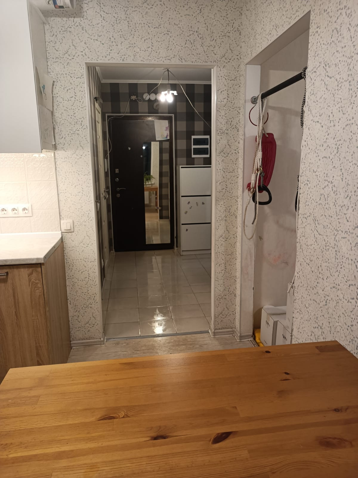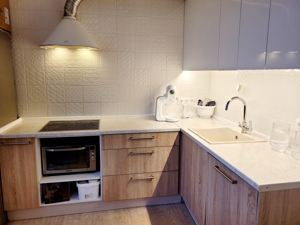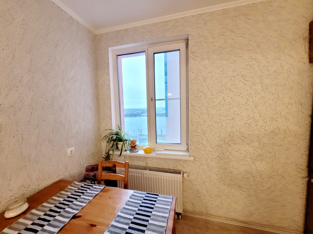Горизонтальная разводка труб, нет отверстий между этажами, что дает дополнительную звукоизоляцию. Встроенная кухня и шкаф в прихожей останутся новым владельцам.