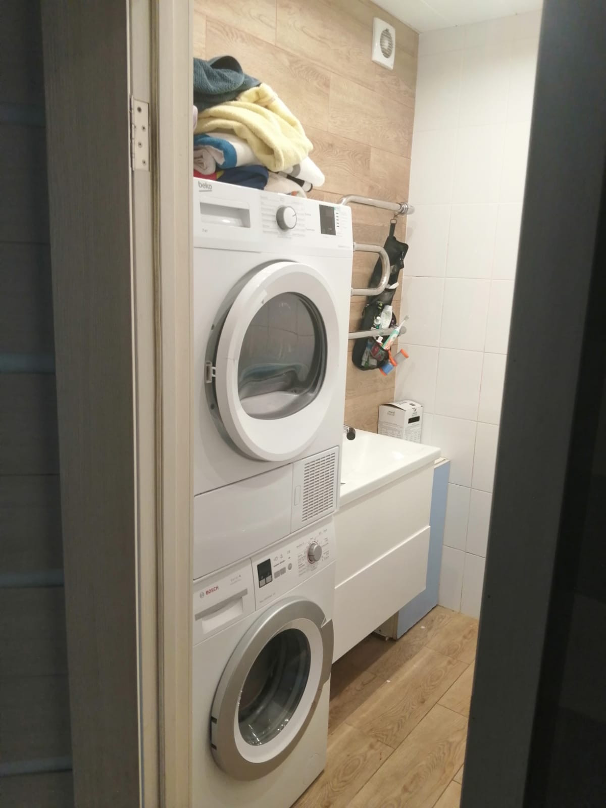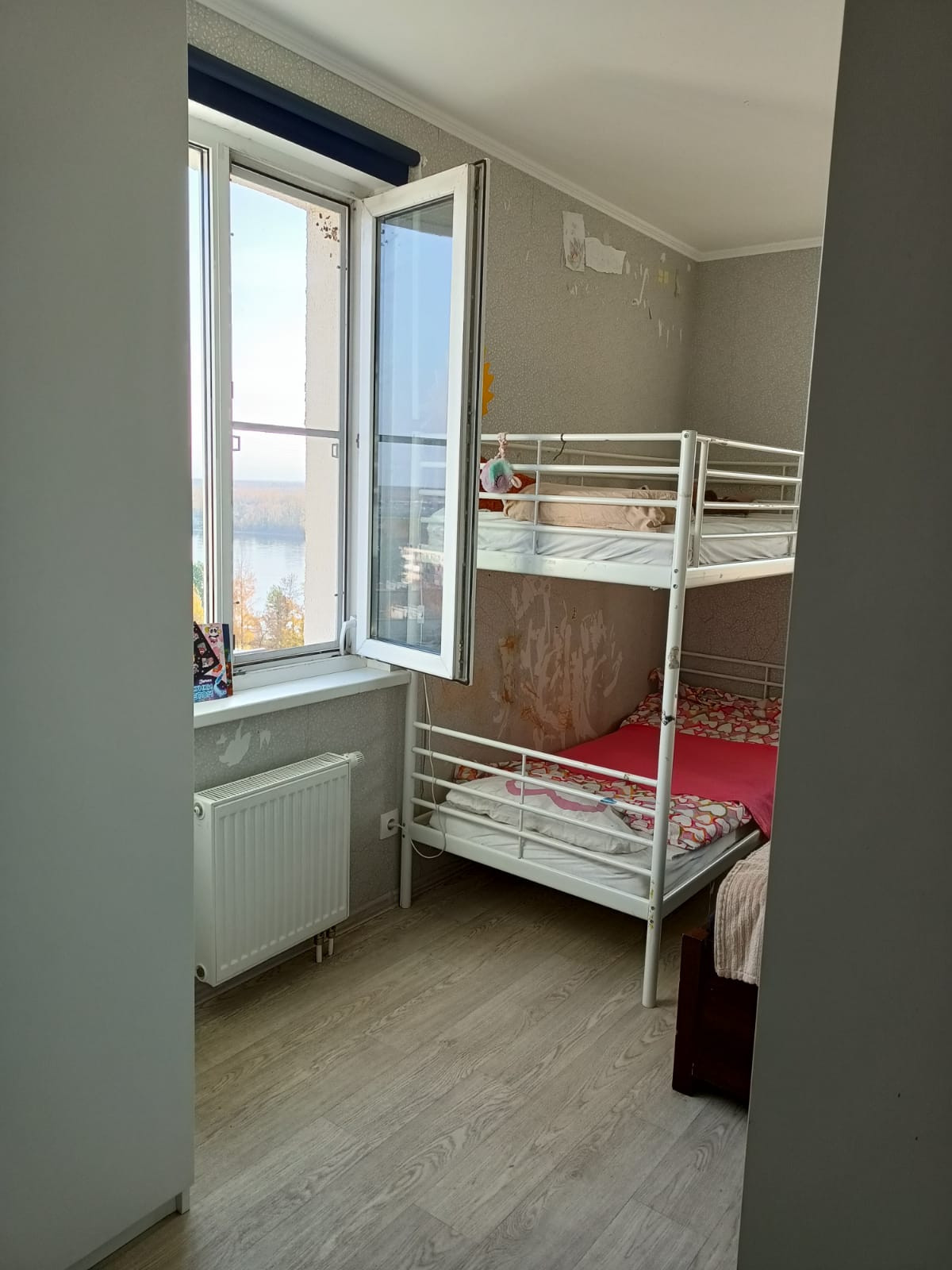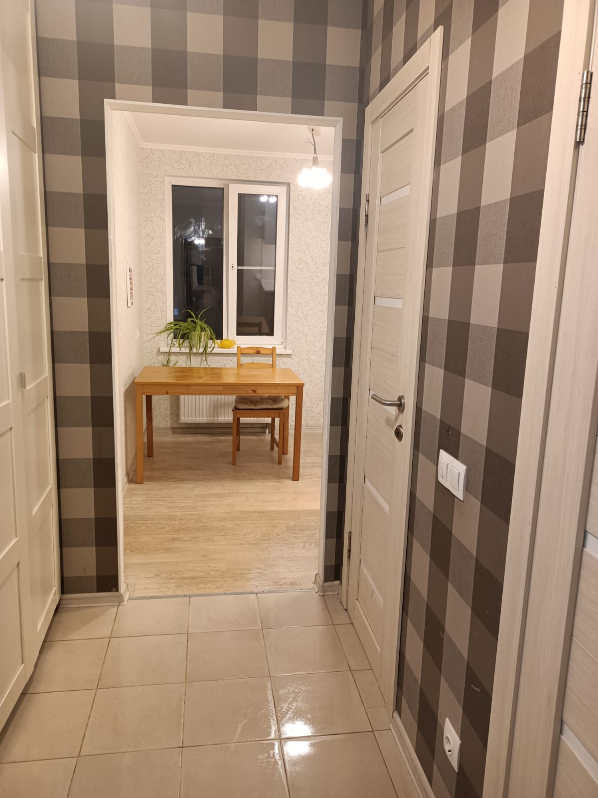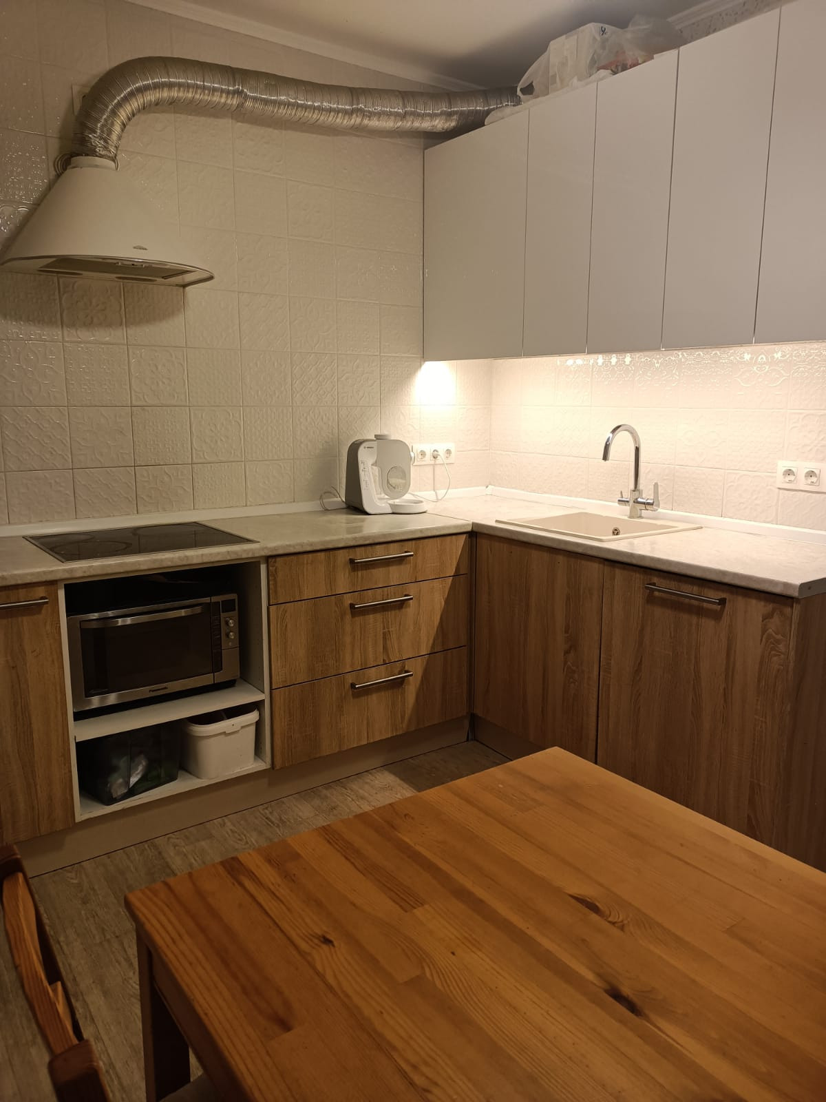 Горизонтальная разводка труб, нет отверстий между этажами, что дает дополнительную звукоизоляцию. Встроенная кухня и шкаф в прихожей останутся новым владельцам.
