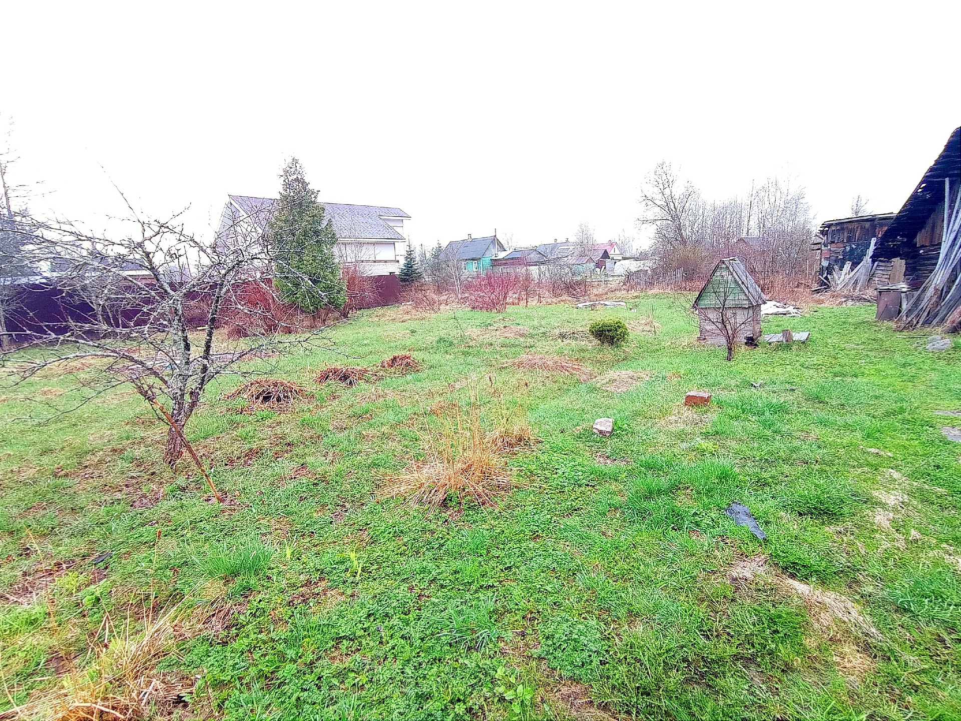 Участок ровный, сухой, разработанный, с плодовыми кустарниками и деревьями (яблони, слива, японский орех). Так же растут туя, дерн, спирея и пионы.