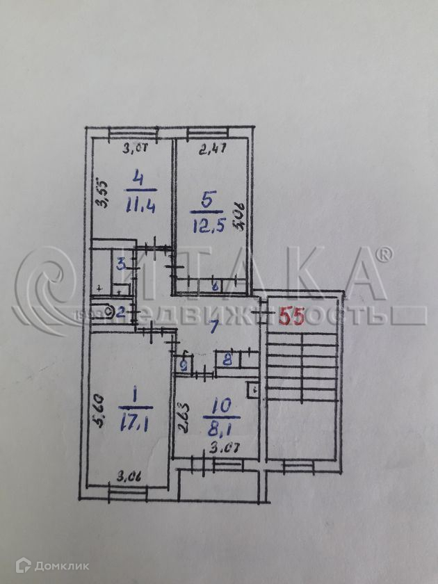 Планировка комнат 17.1 кв.м., 12,5 кв.м. и 11,4 кв.м. изолированная. Кухня 8,1 кв.м. с большой 6-метровой лоджией.