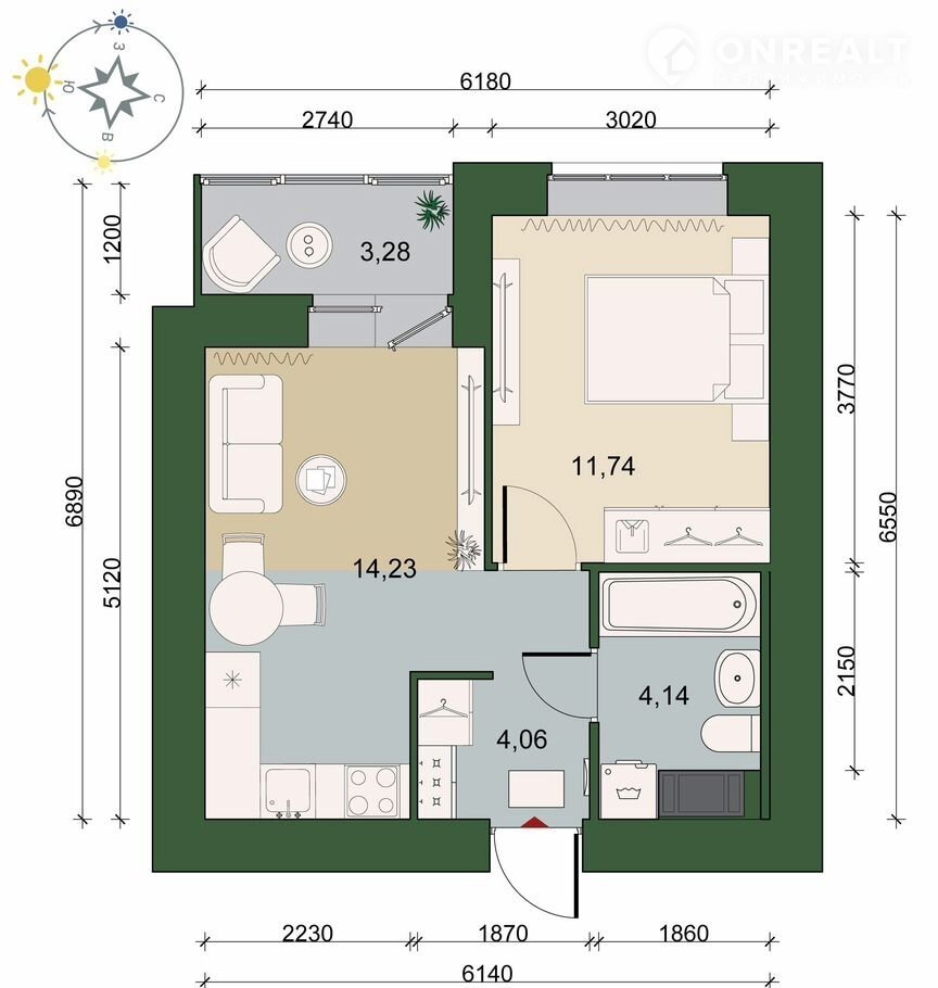 Общая площадь 35.8 м2
