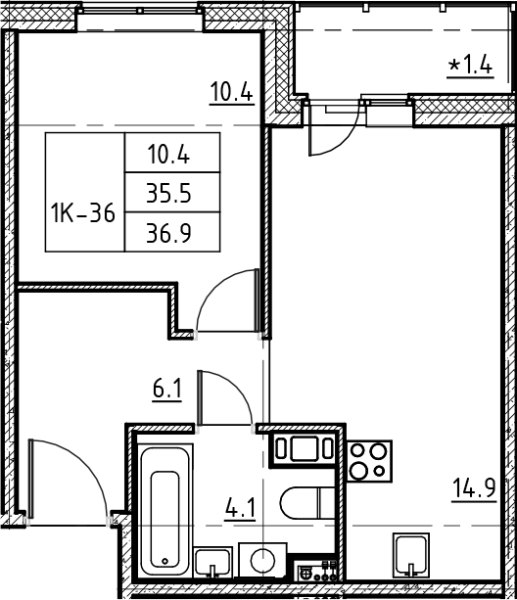 Общая площадь 36.9 м2