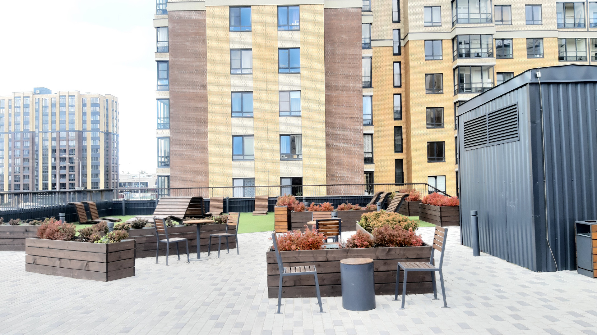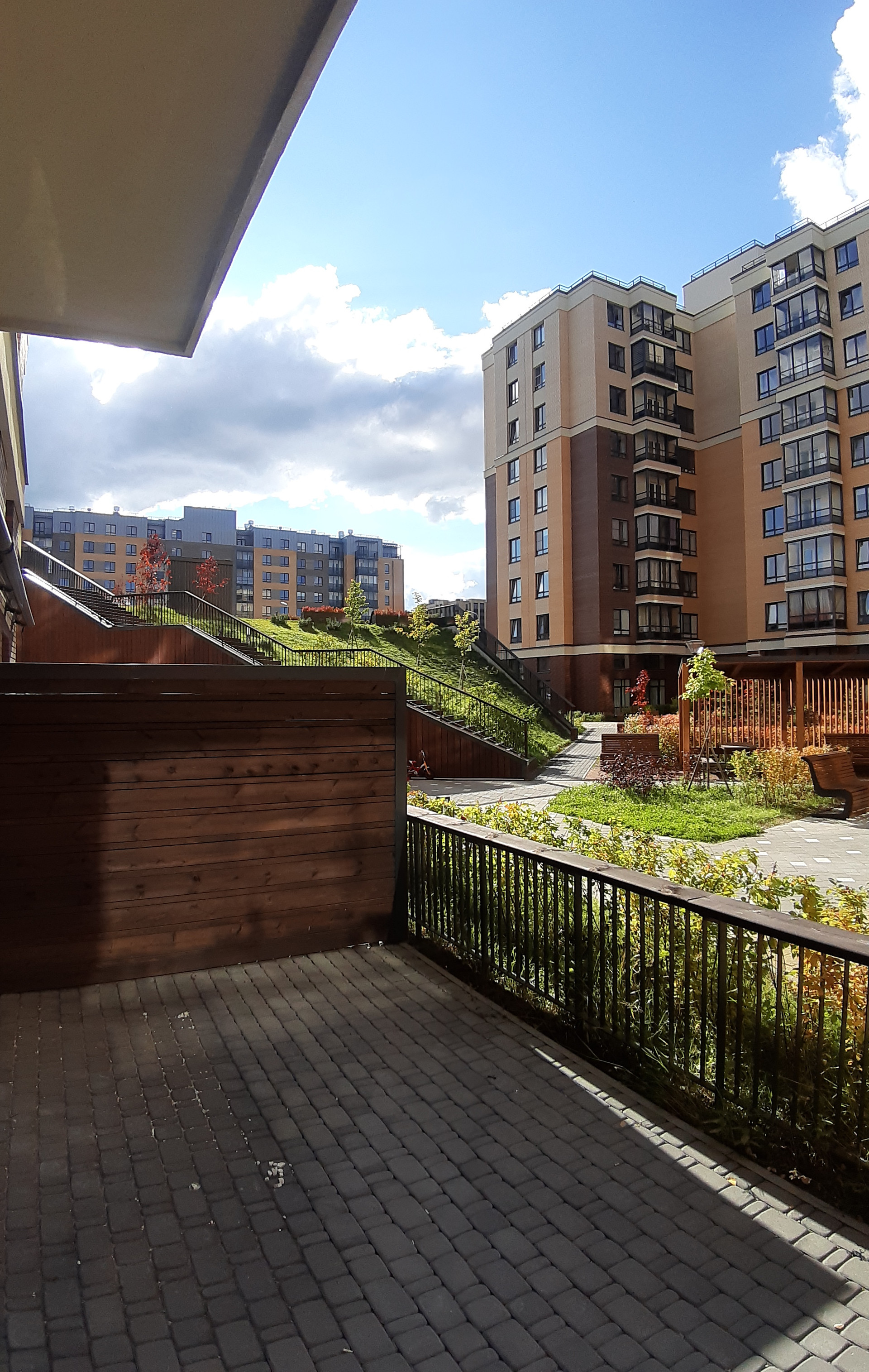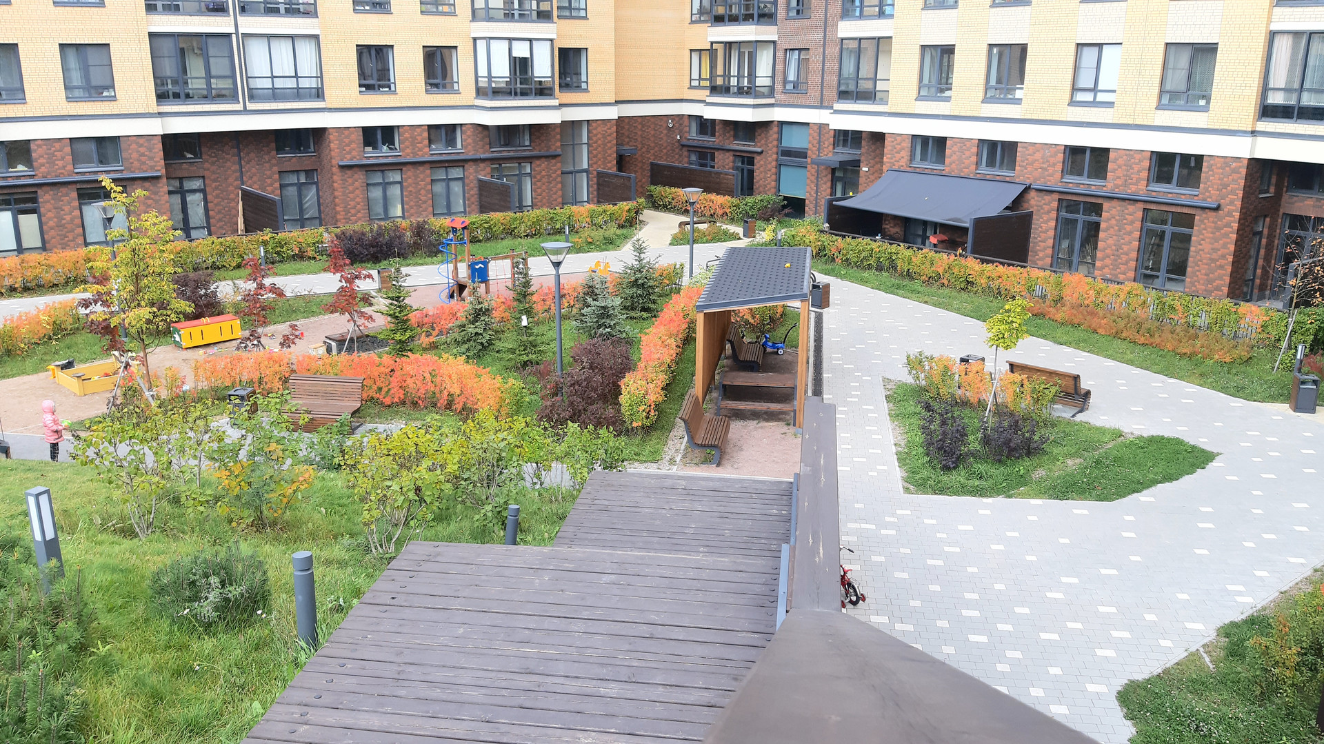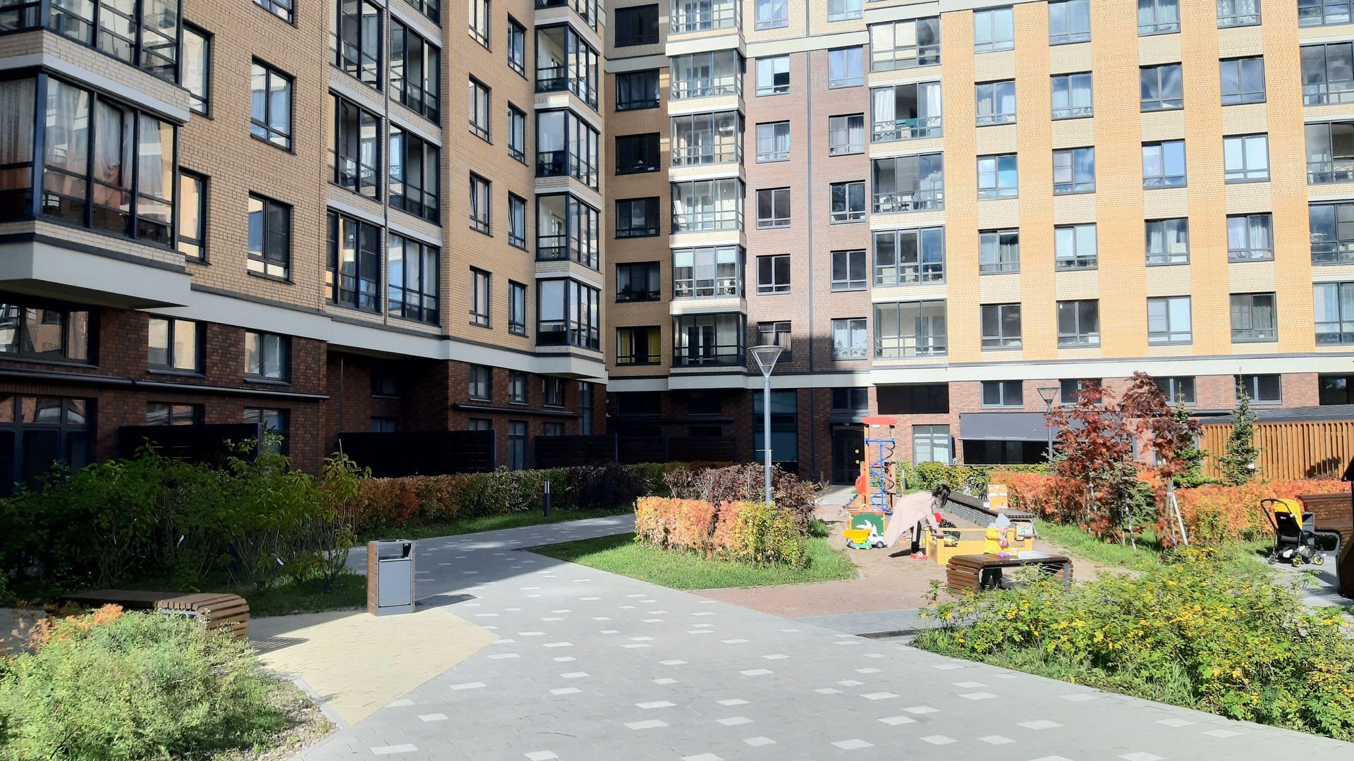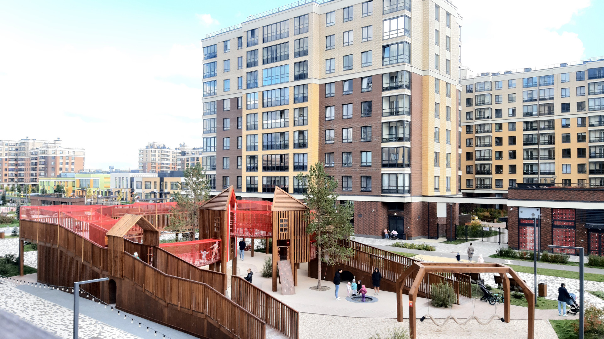 Комплекс с закрытыми дворами без машин, с зонами отдыха для детей и взрослых, ландшафтным дизайном. Во дворе  свои 2 детских сада и школа, 2 офисно-торговых центра, спорт комплекс с бассейном, множество магазинов, кафе, своя прогулочная аллея.