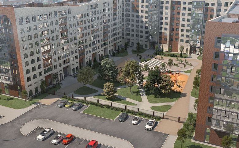 Закрытый двор с ландшафтным дизайном, спортивными и детскими площадками.