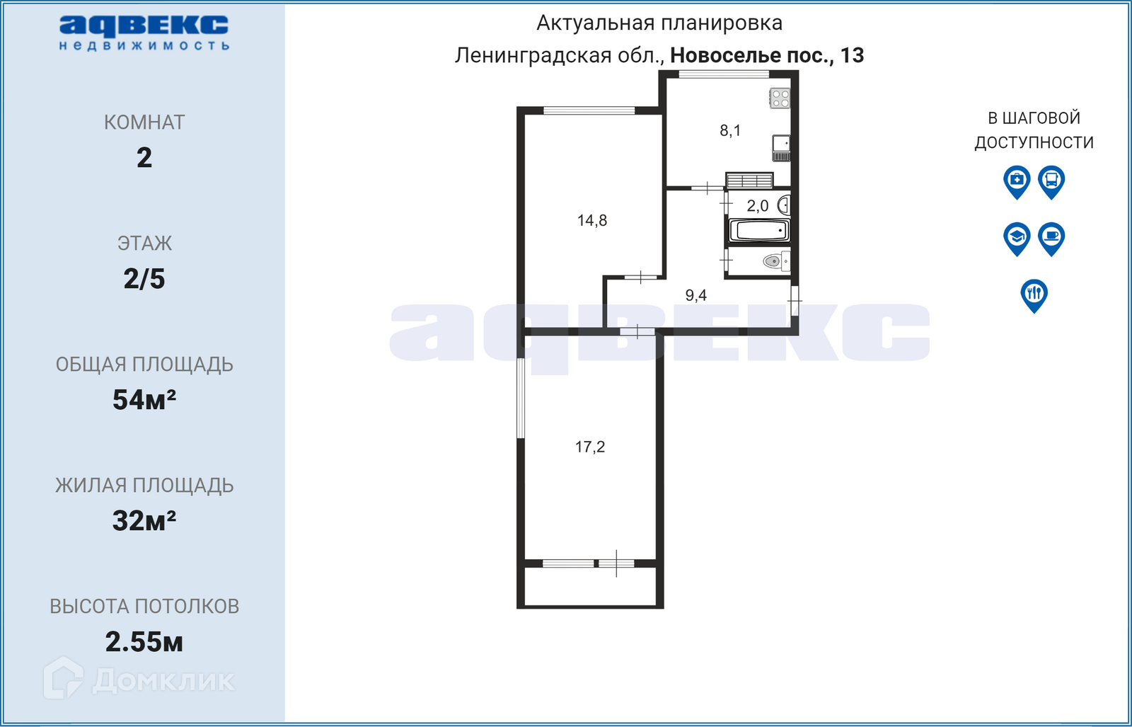 2-комнатная квартира, 54 м2, этаж 2 / 5, на продажу в городском посёлке Новоселье, городской посёлок Новоселье, 13