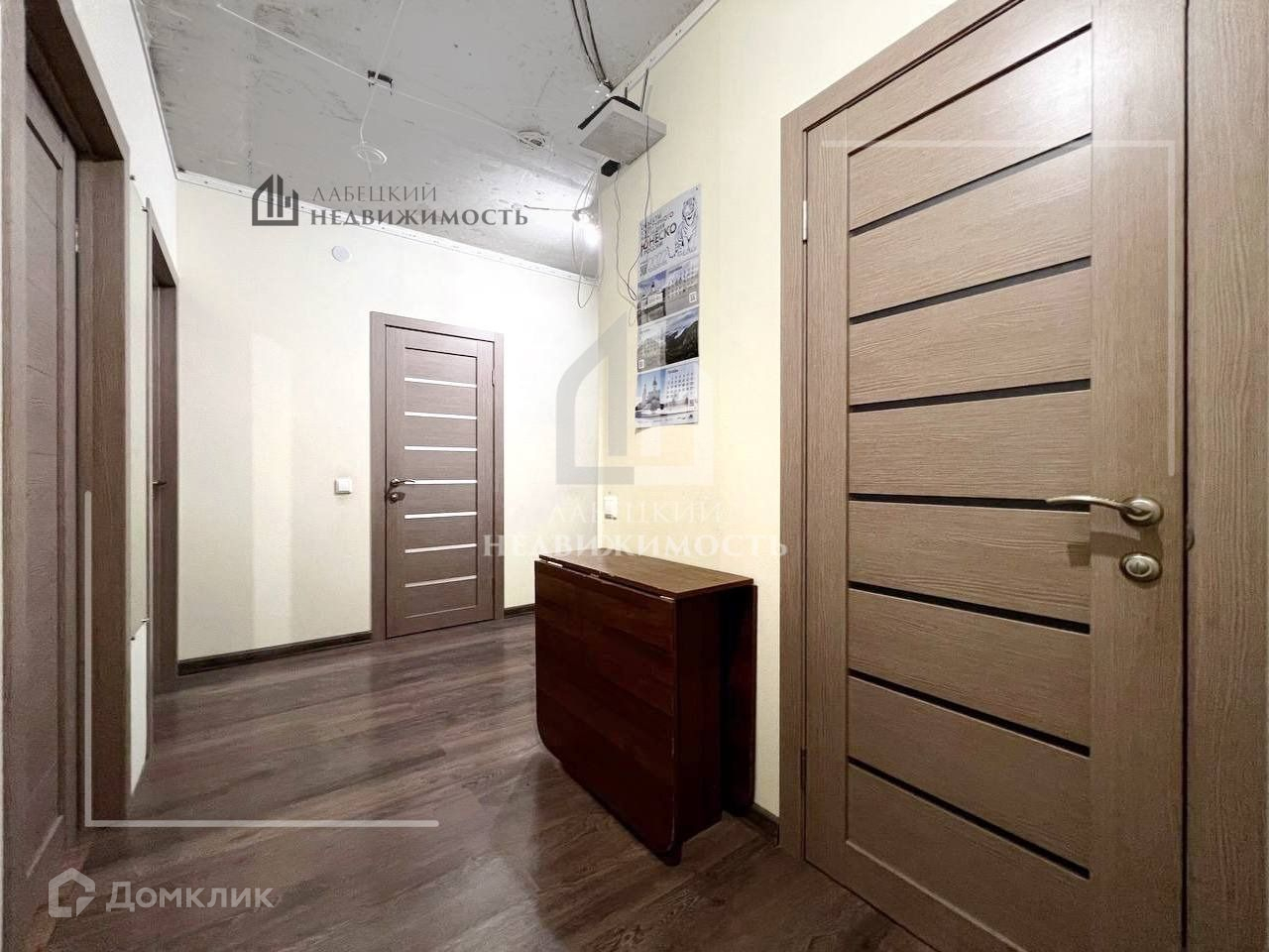 На полу ЛАМИНАТ, в санузлах и в рабочей зоне кухни – ПЛИТКА.