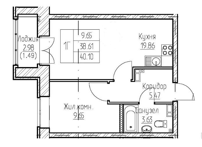 Общая площадь 38.61 м2