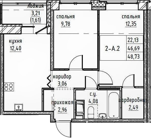 Общая площадь 48.73 м2