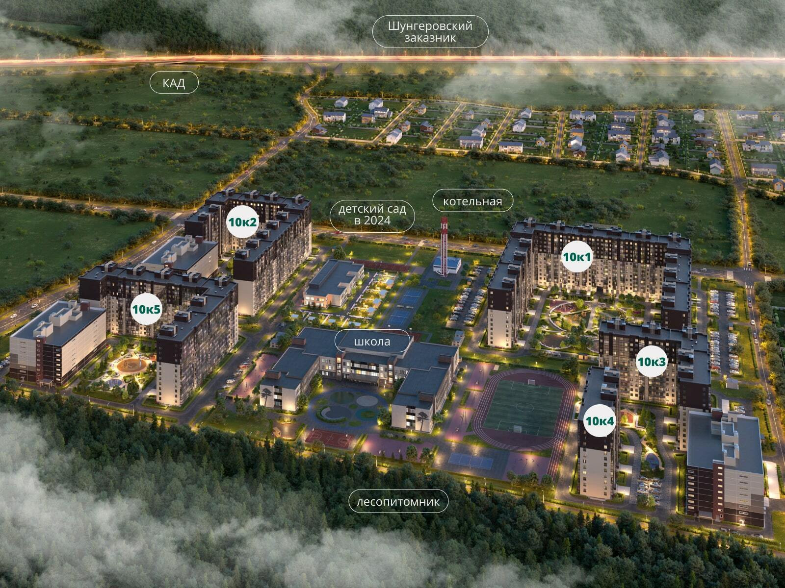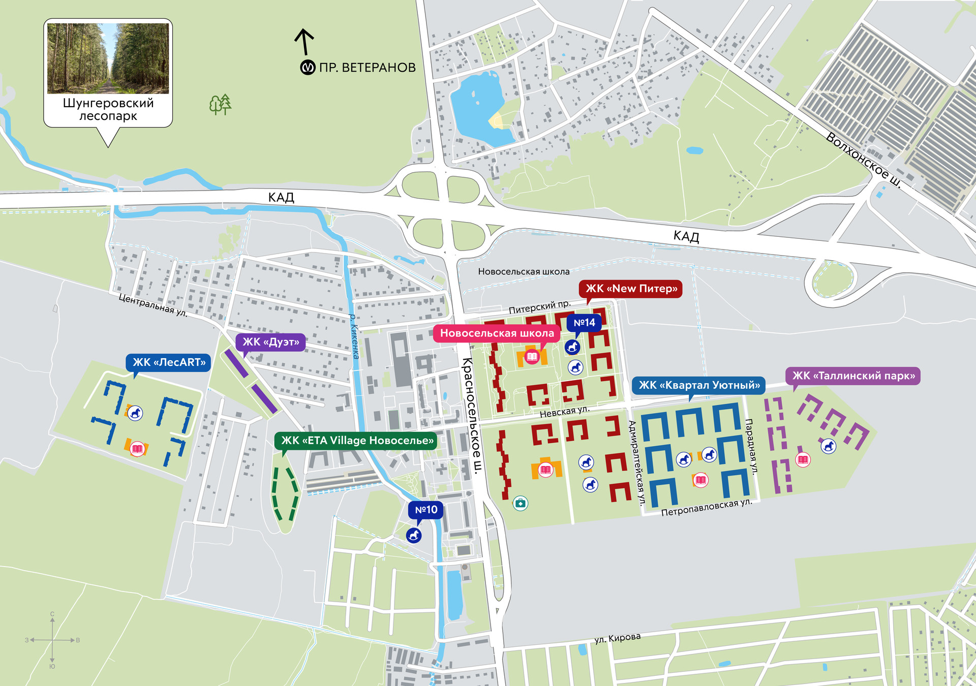 Жилой комплекс расположен в окружении зелени, вблизи — леспопитомник, рядом — Шунгеровский лесопарк. В 10 минутах на автомобиле Стрельна, Финский залив и Петродворец. За 20 минут можно добраться до аэропорта, а за 45 доехать до центра города. Рядом расположена развитая сеть социальной и коммерческой инфраструктуры: школы, детские сады, магазины, каток, пекарни, амбулатория, салоны красоты и фитнес-центры.