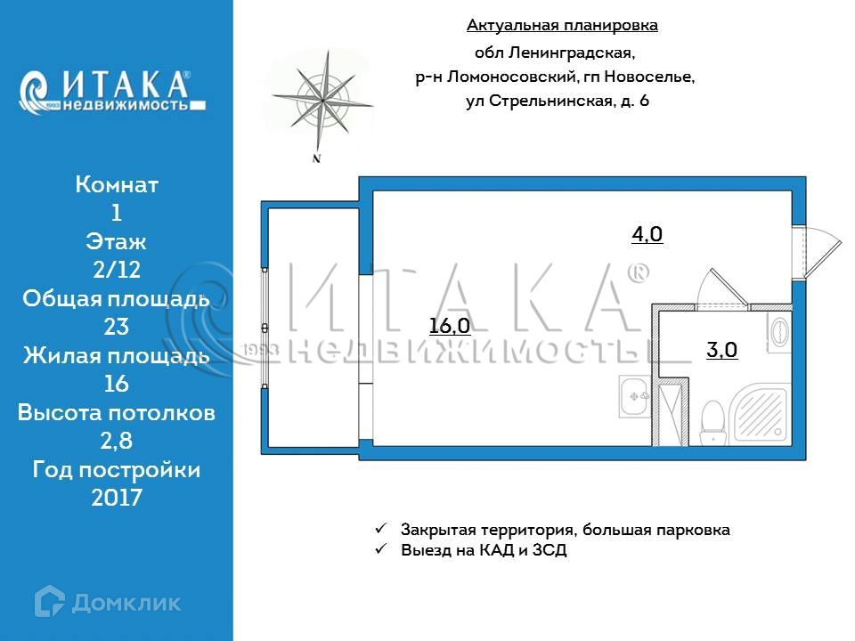 Квартира студия, 23 м2, этаж 2 / 12, на продажу в городском посёлке Новоселье, Стрельнинская улица, 6
