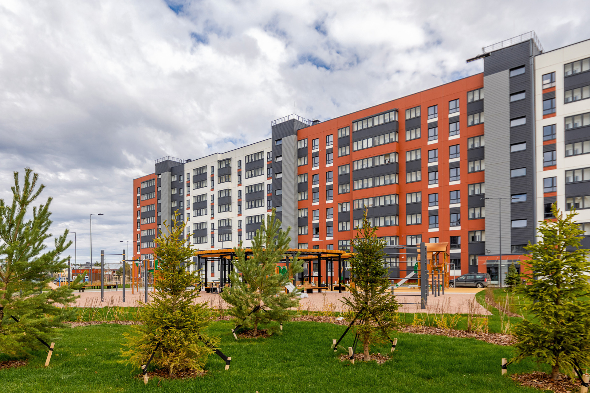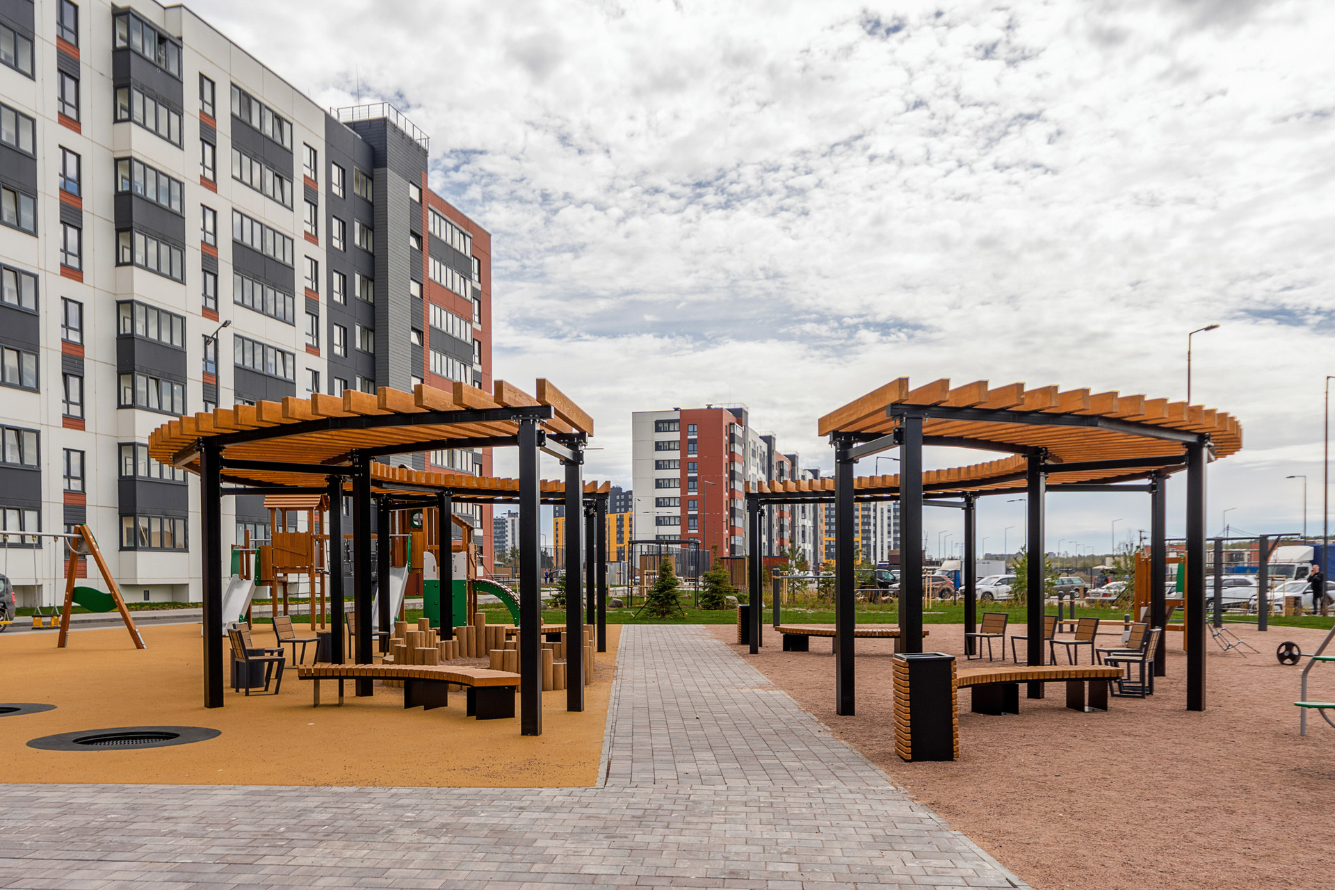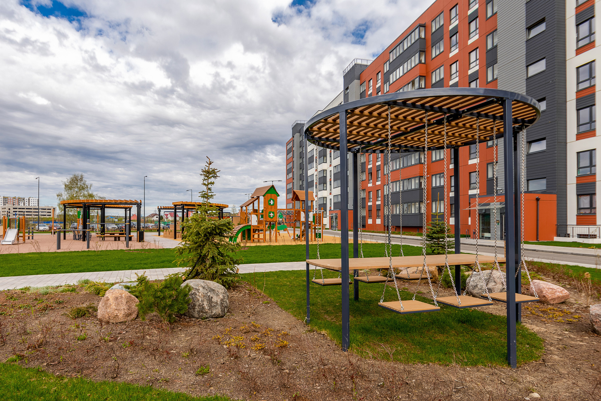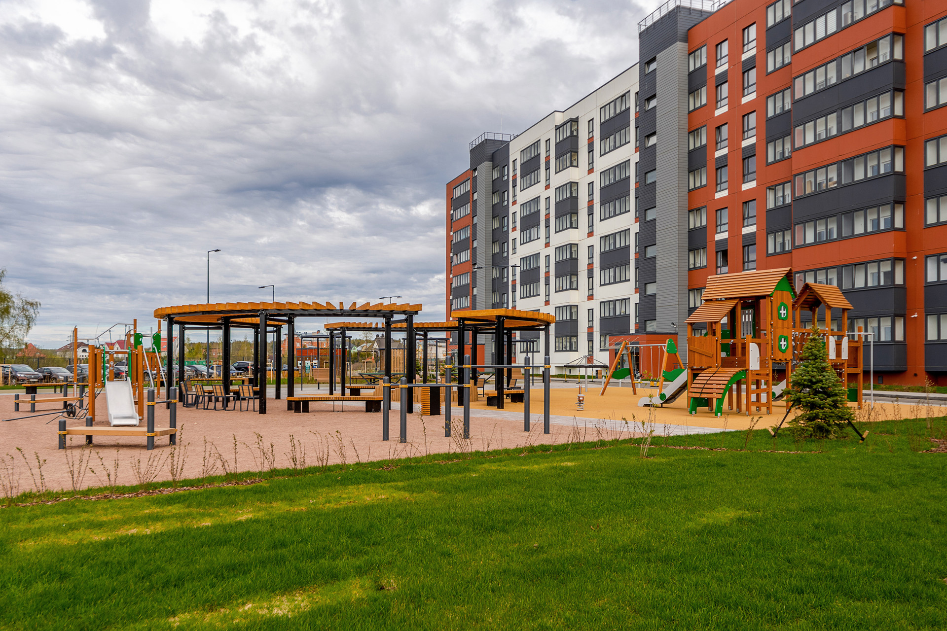 + В зеленом дворе-парке оборудованы современные детские и спортивные площадки, обустроены места для отдыха;