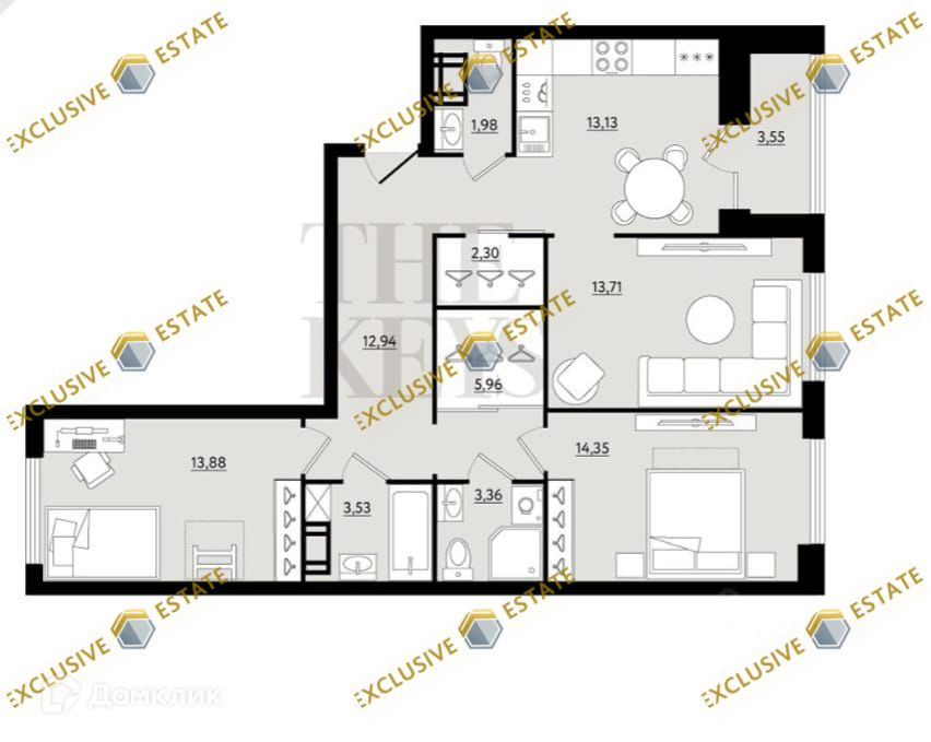 Кухня-гостиная – 35.30 м2 - увеличена зона гостиной за счет гардеробных.