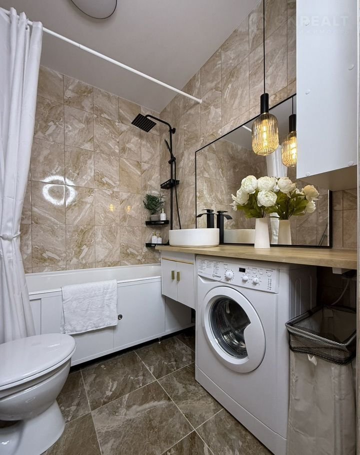 Ванная комната: стиральная машина, столешница, стеллаж, ванна, унитаз, раковина со смесителем, потолочный светильник.