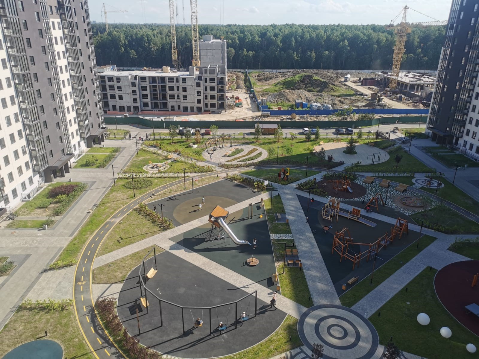Уже произведено озеленение хвоей и установлены детские площадки.