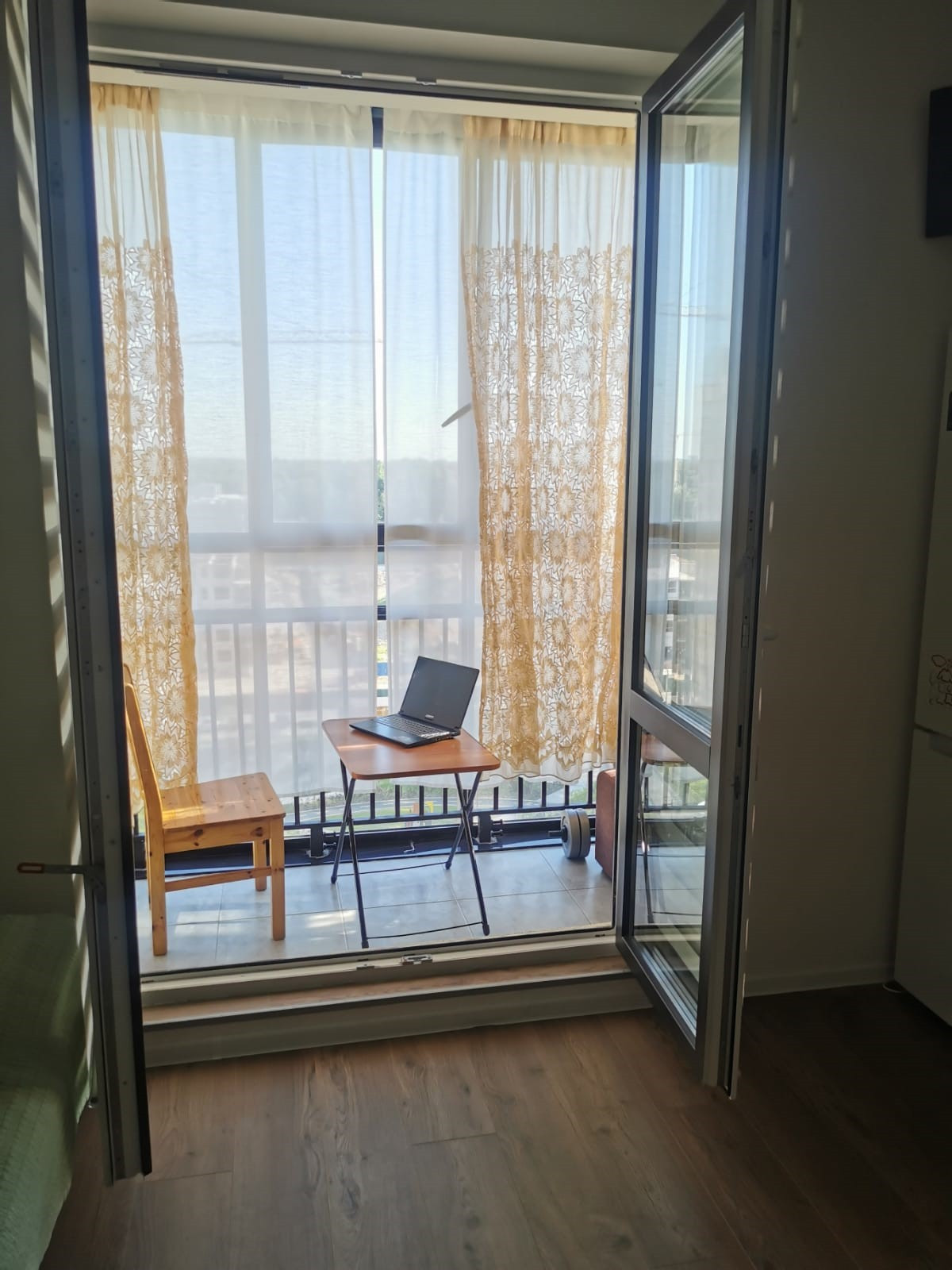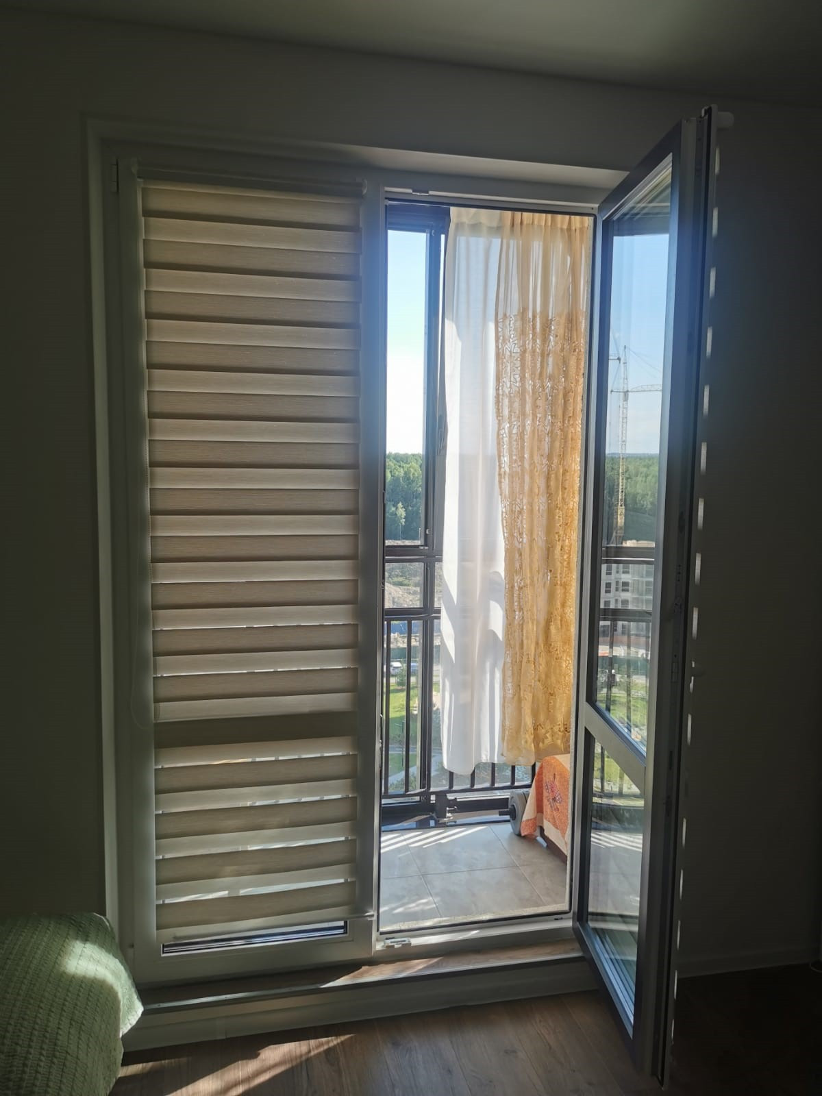 вид- в закрытый двор без машин, с хвойным озеленением и детскими площадками. Рядом лесопитомник.