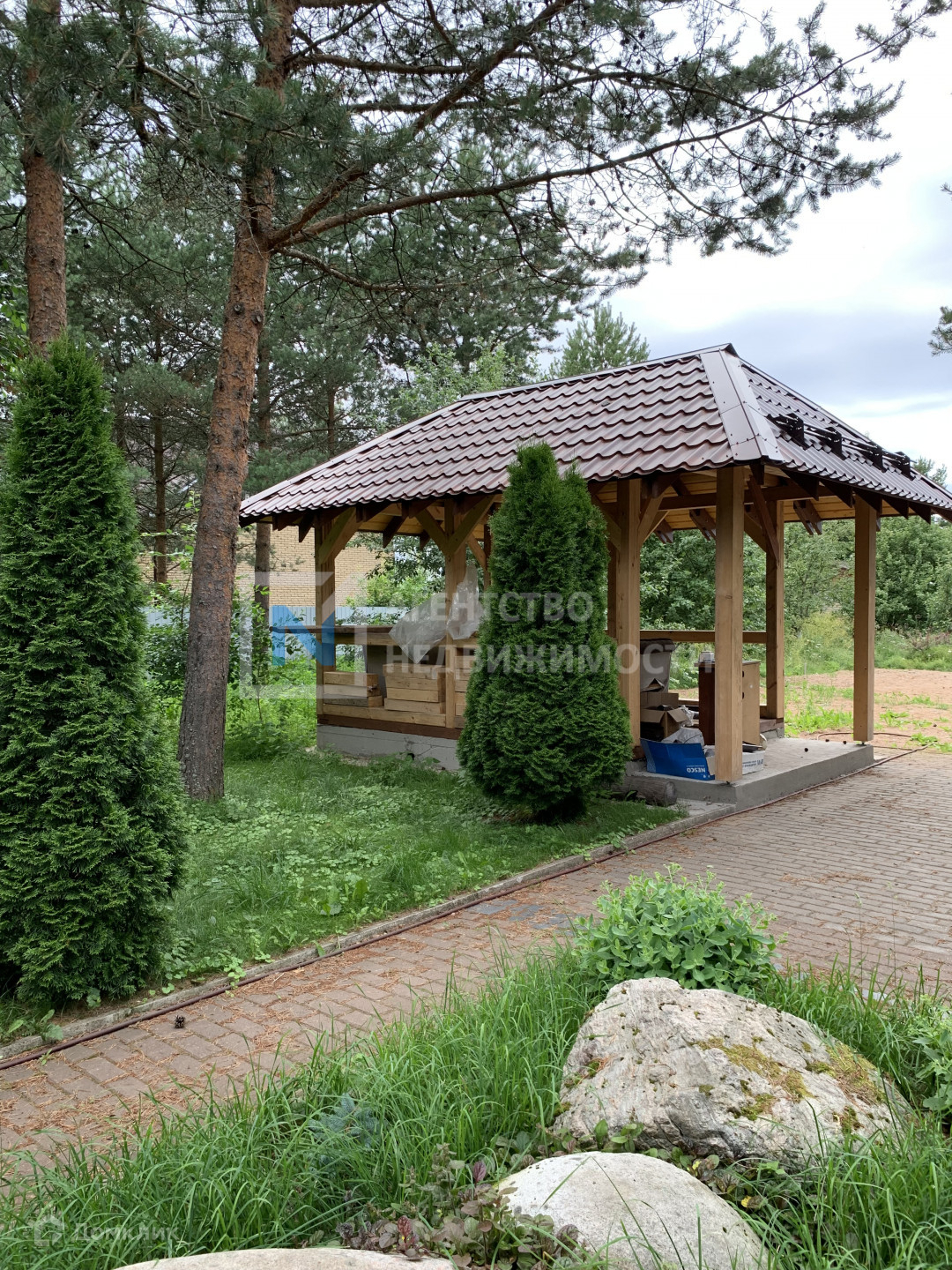На участке построена бревенчатая  баня и беседка.