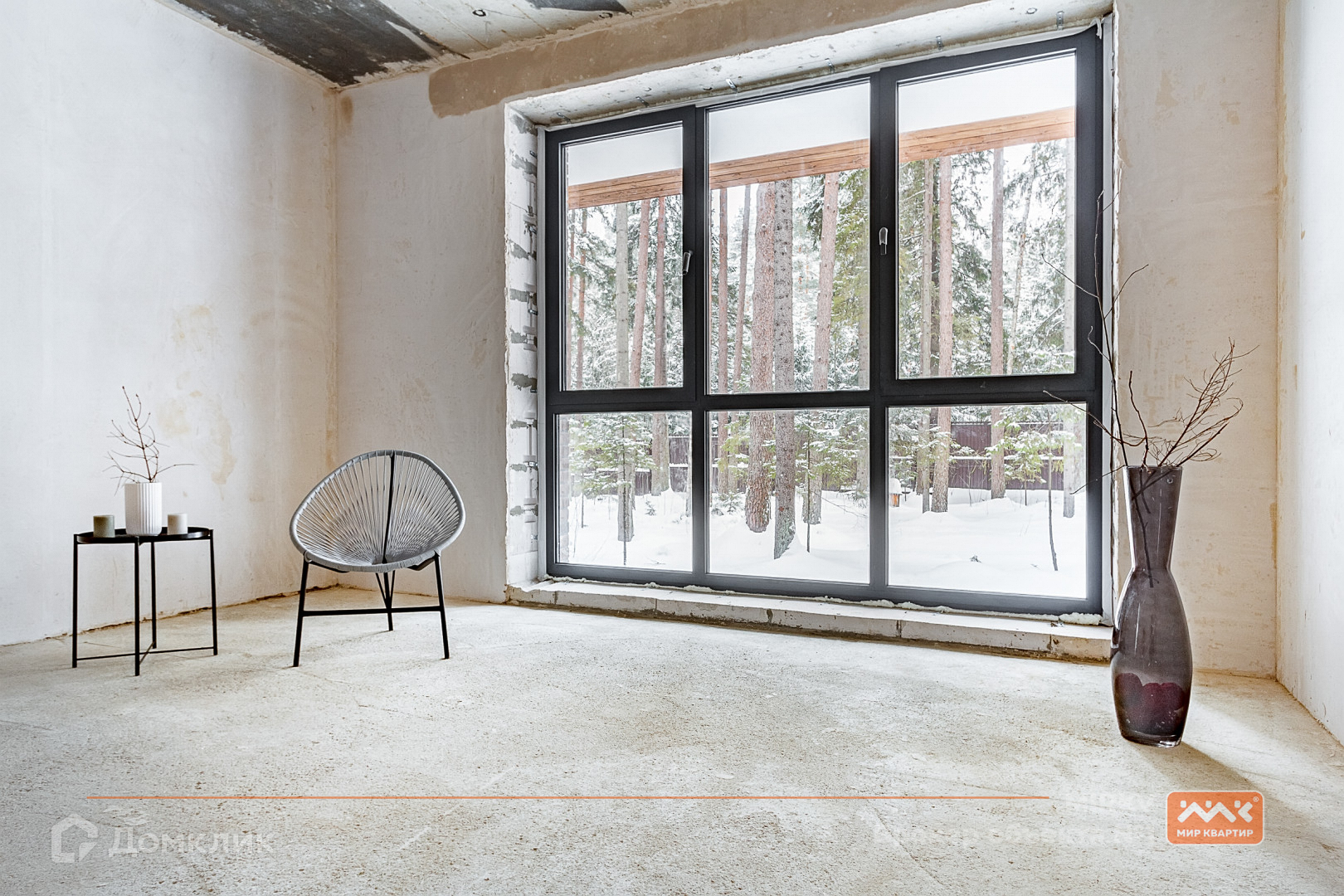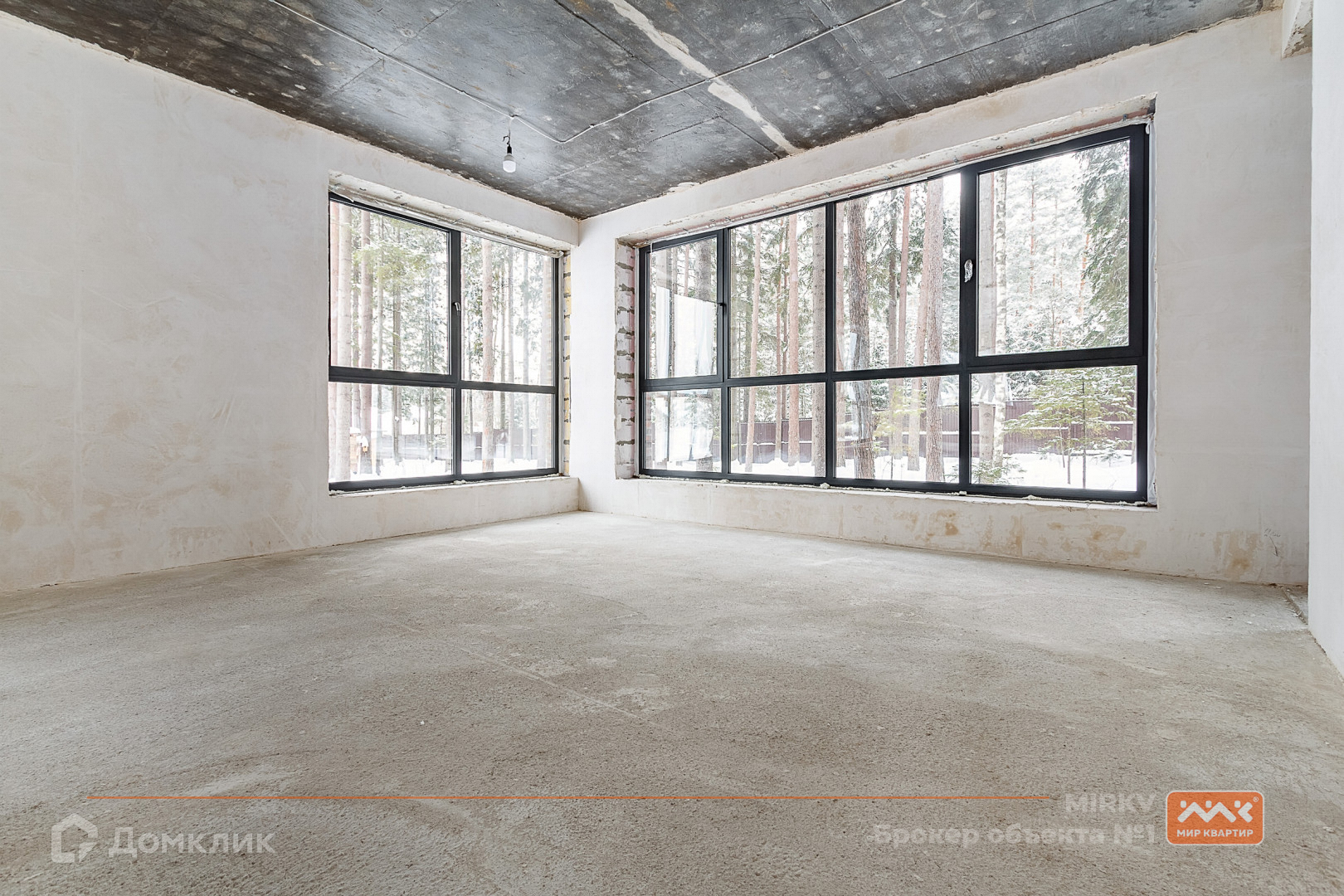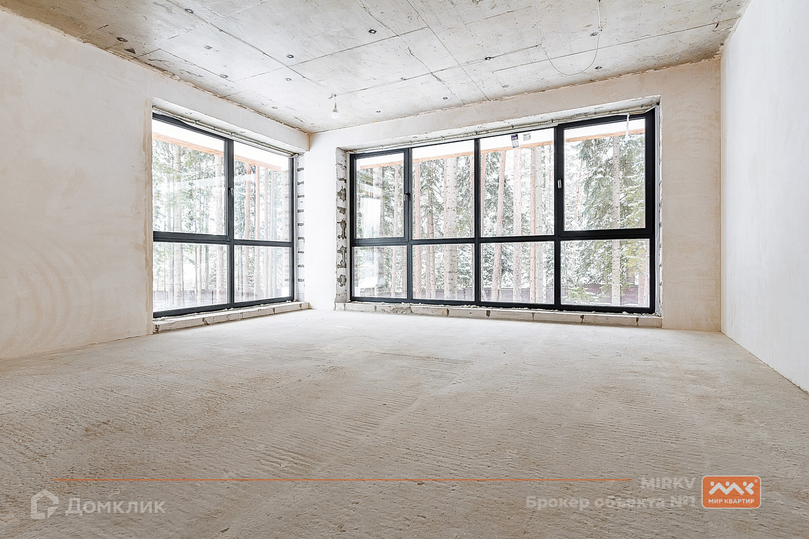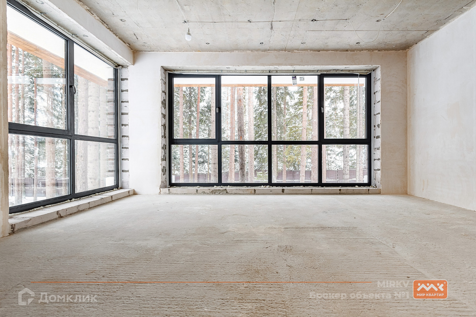огромные окна в пол с видом на сосновый лес;