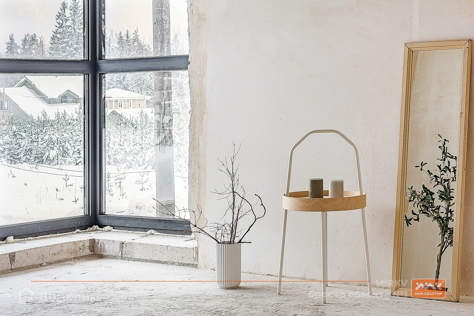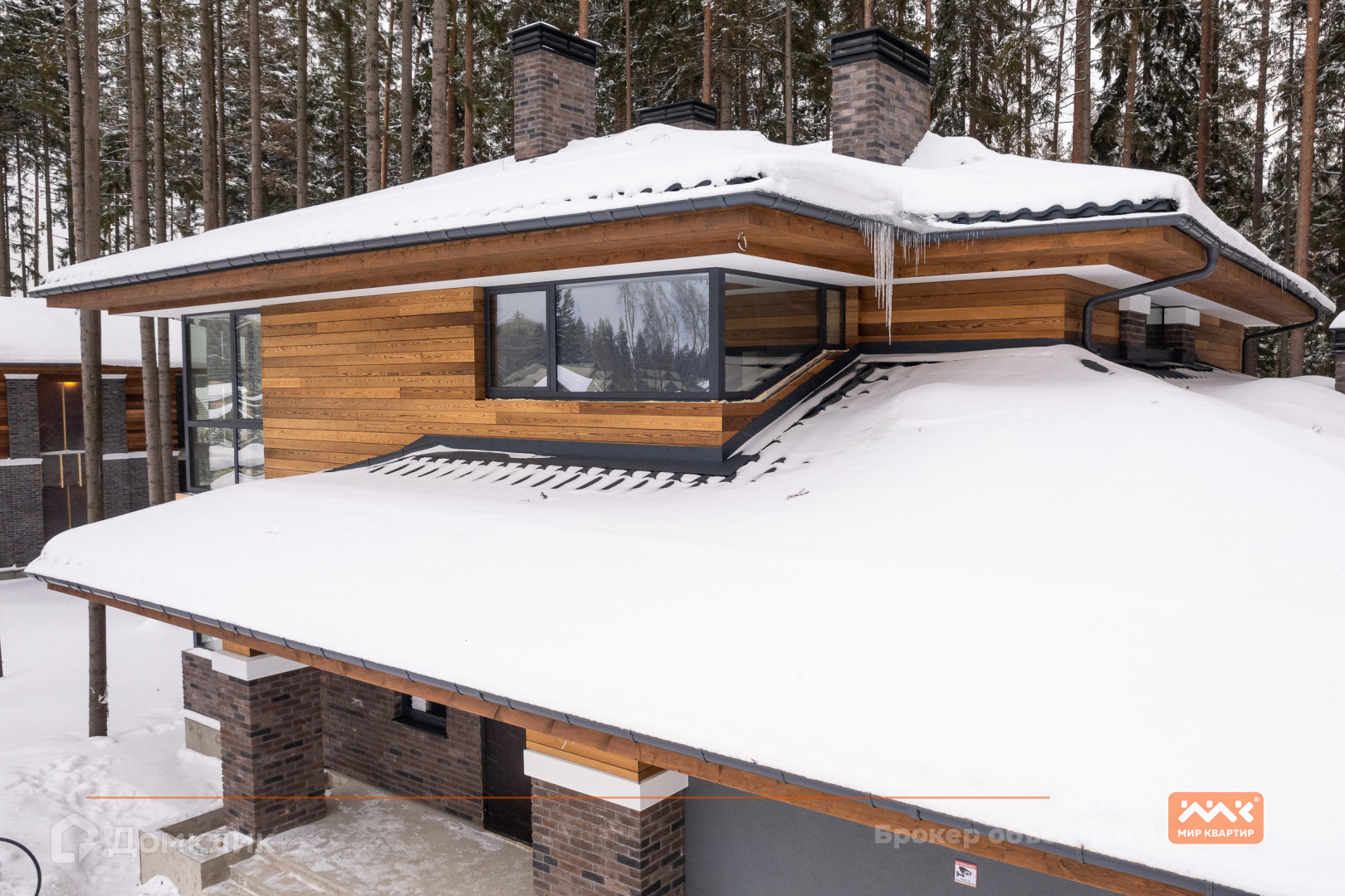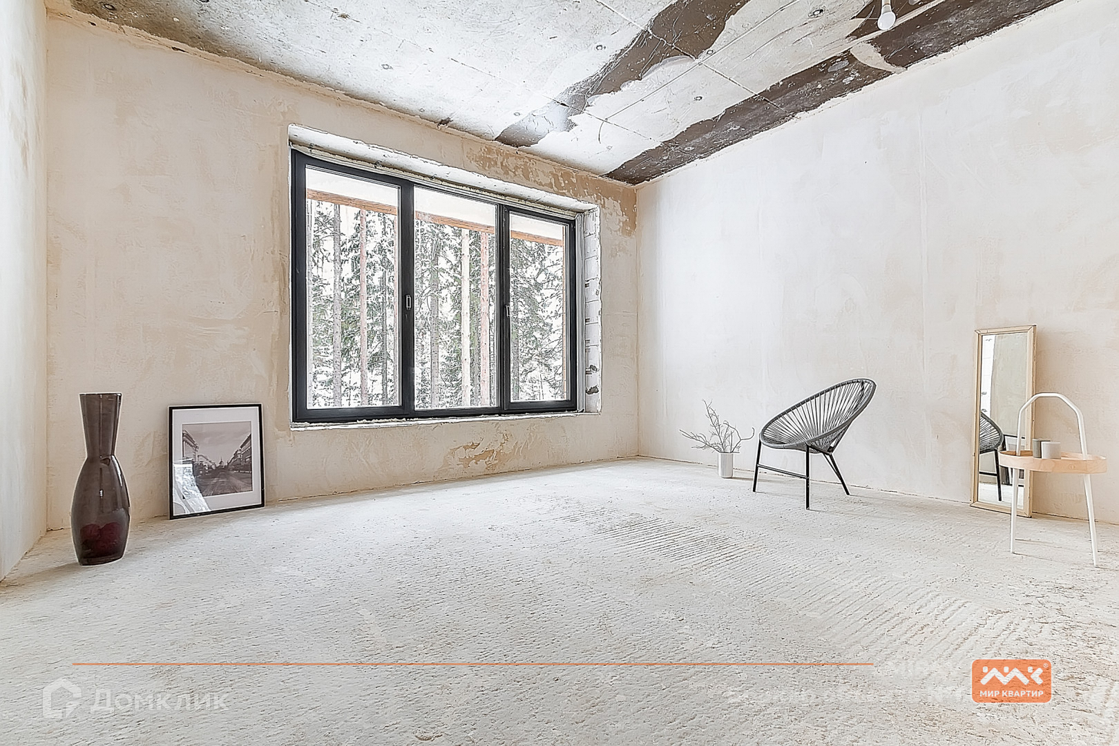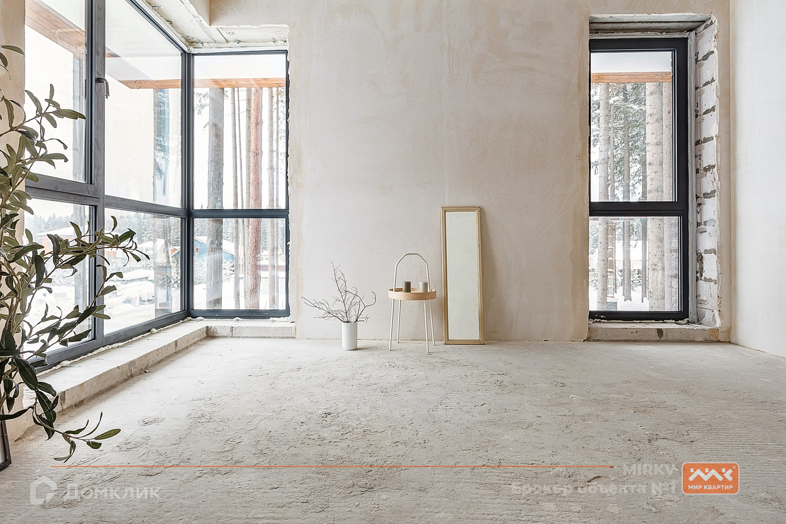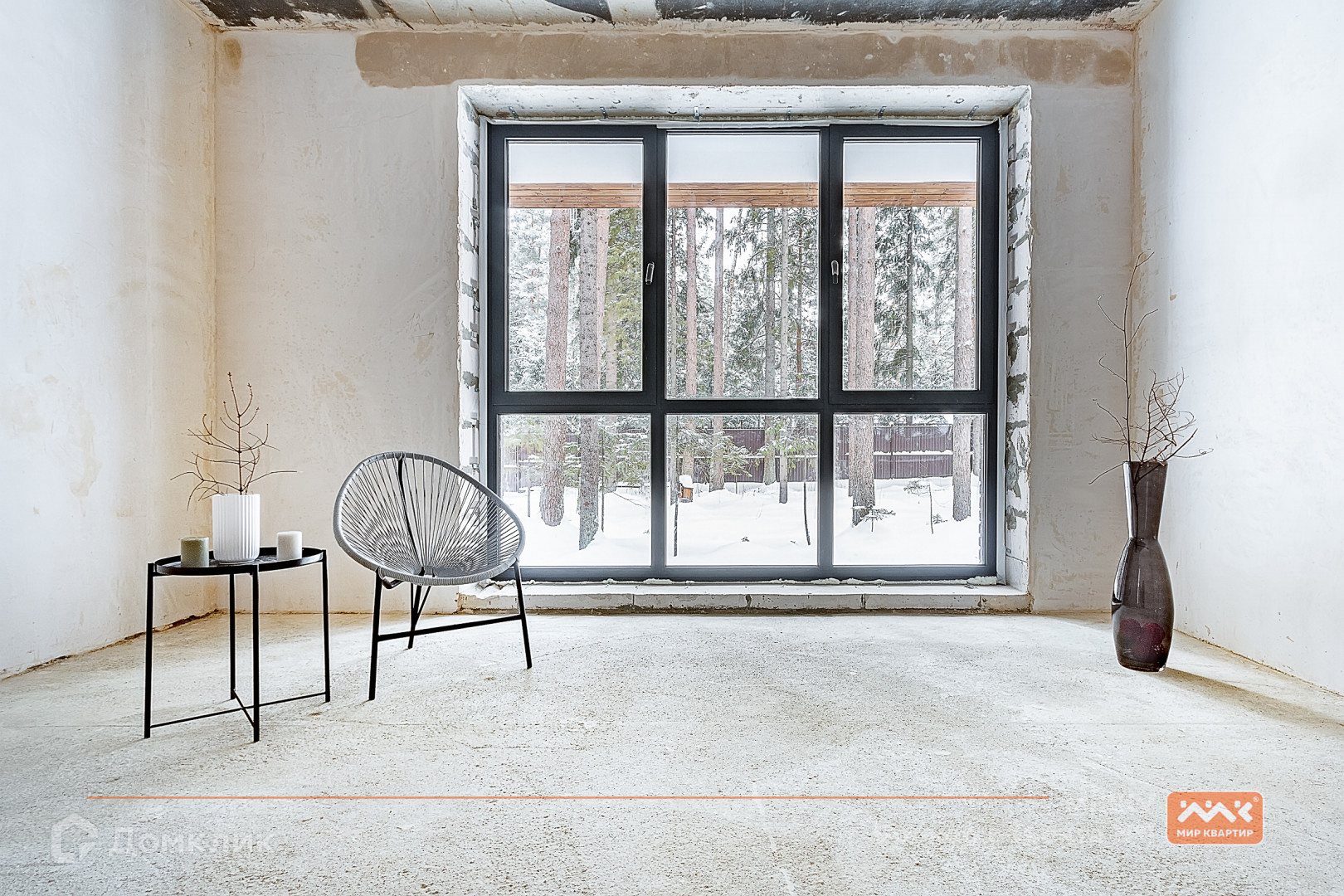 огромные окна в пол с видом на сосновый лес;