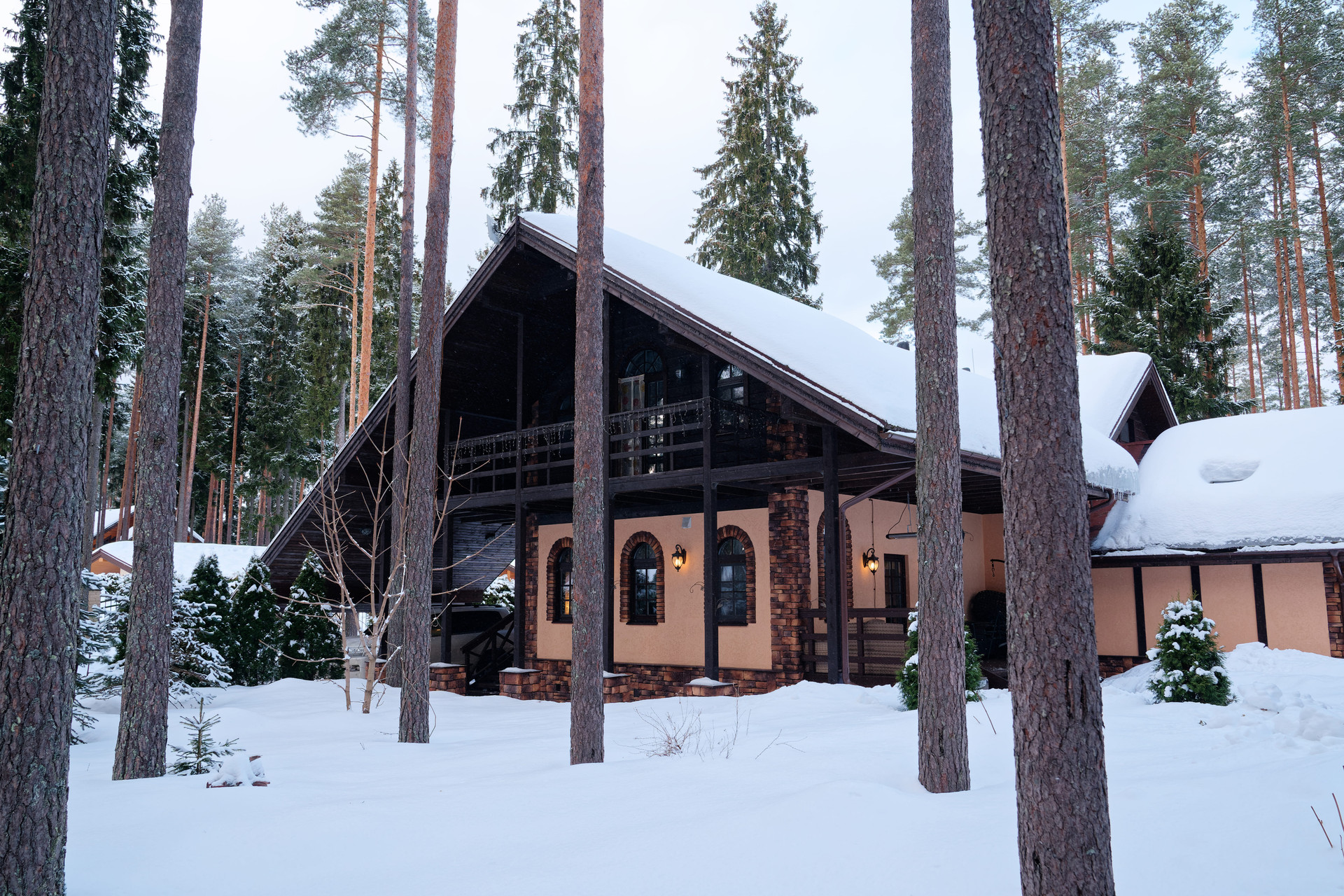 Дом, общей площадью 236,5 кв.м и веранда с баней 86 кв.м, утопающие среди сосен на участке 24 сотки, расположены в коттеджном поселке «Еловая Аллея», участок на границе с сосновым лесом.