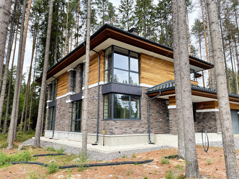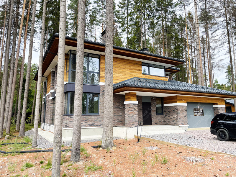 Современный коттедж с высокими потолками и панорамным остеклением в коттеджном поселке «Достоевский» (Курортное направление, Рощино).