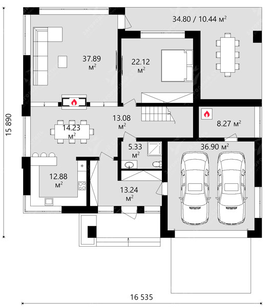 Шикарная современная планировка: просторная кухня-гостиная с высокими потолками, панорамными окнами и выходом на открытую террасу, 4 спальные комнаты (в том числе мастер-спальня со своим санузлом),3 санузла, гараж на 2 машины.