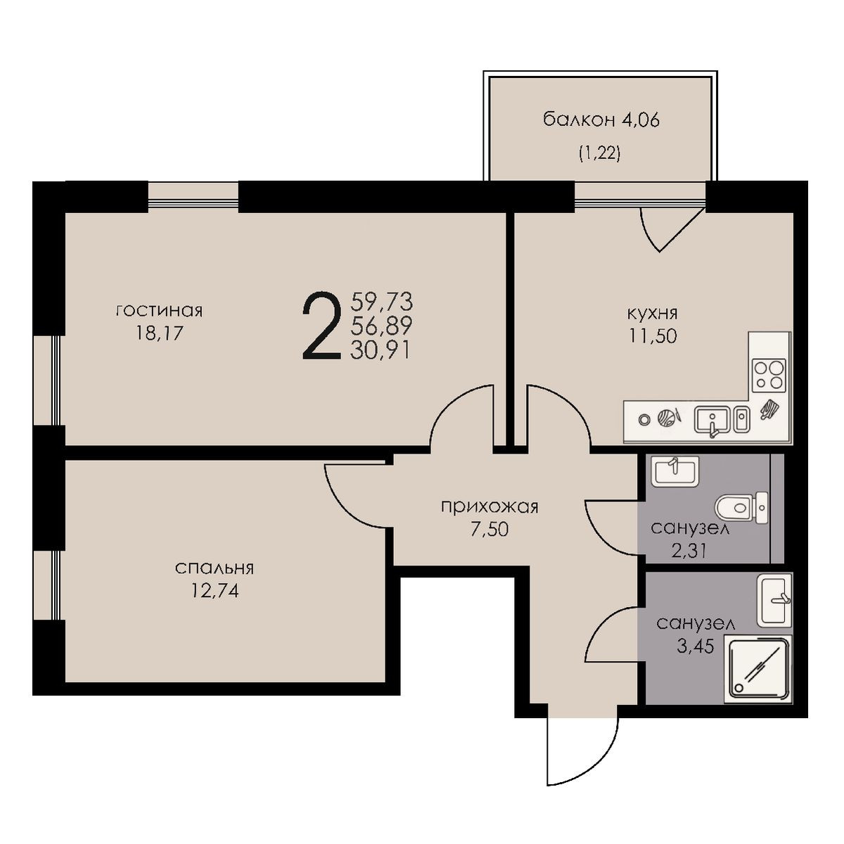 Общая площадь 56.89 м2