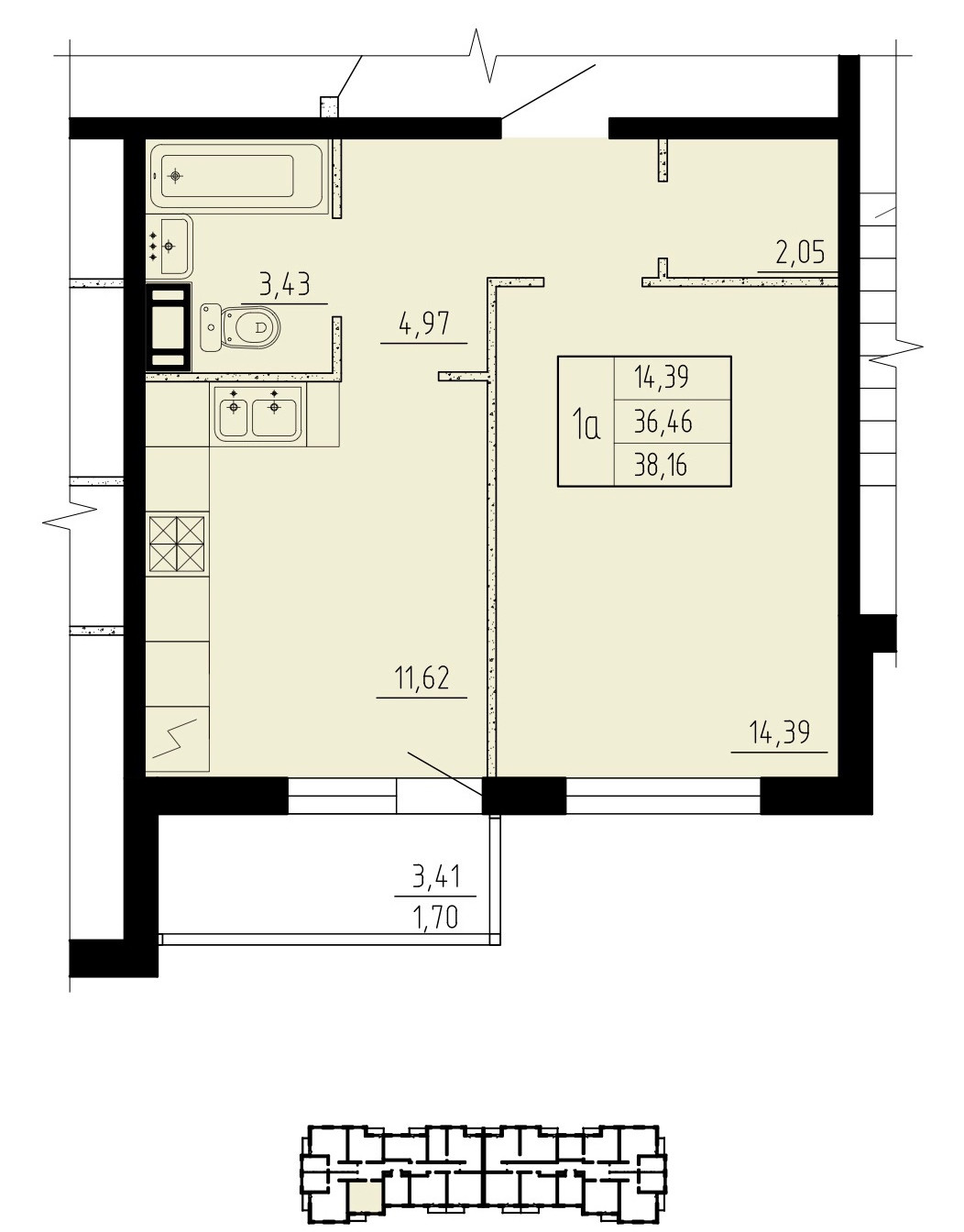 Общая площадь квартиры 38,16 метров.