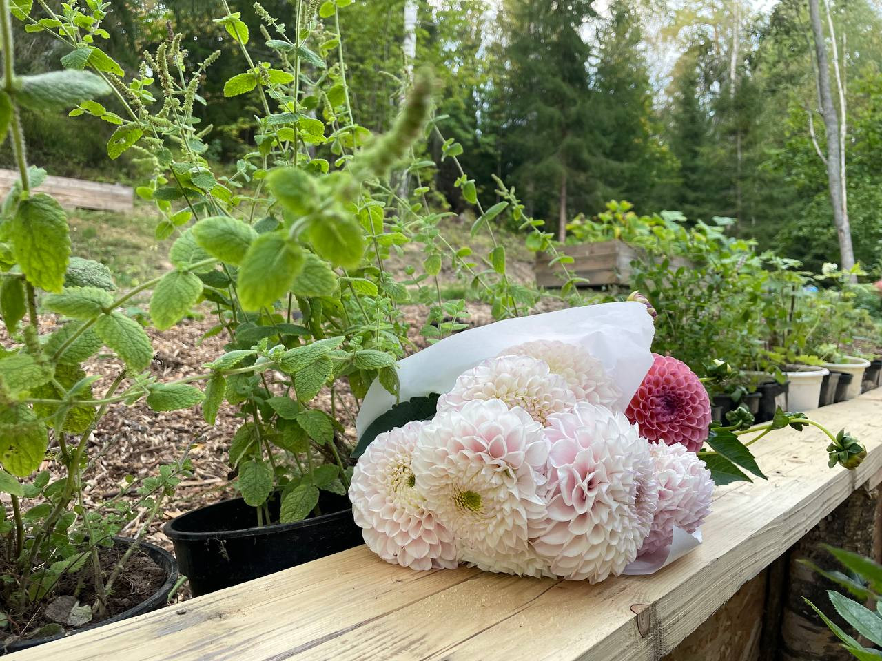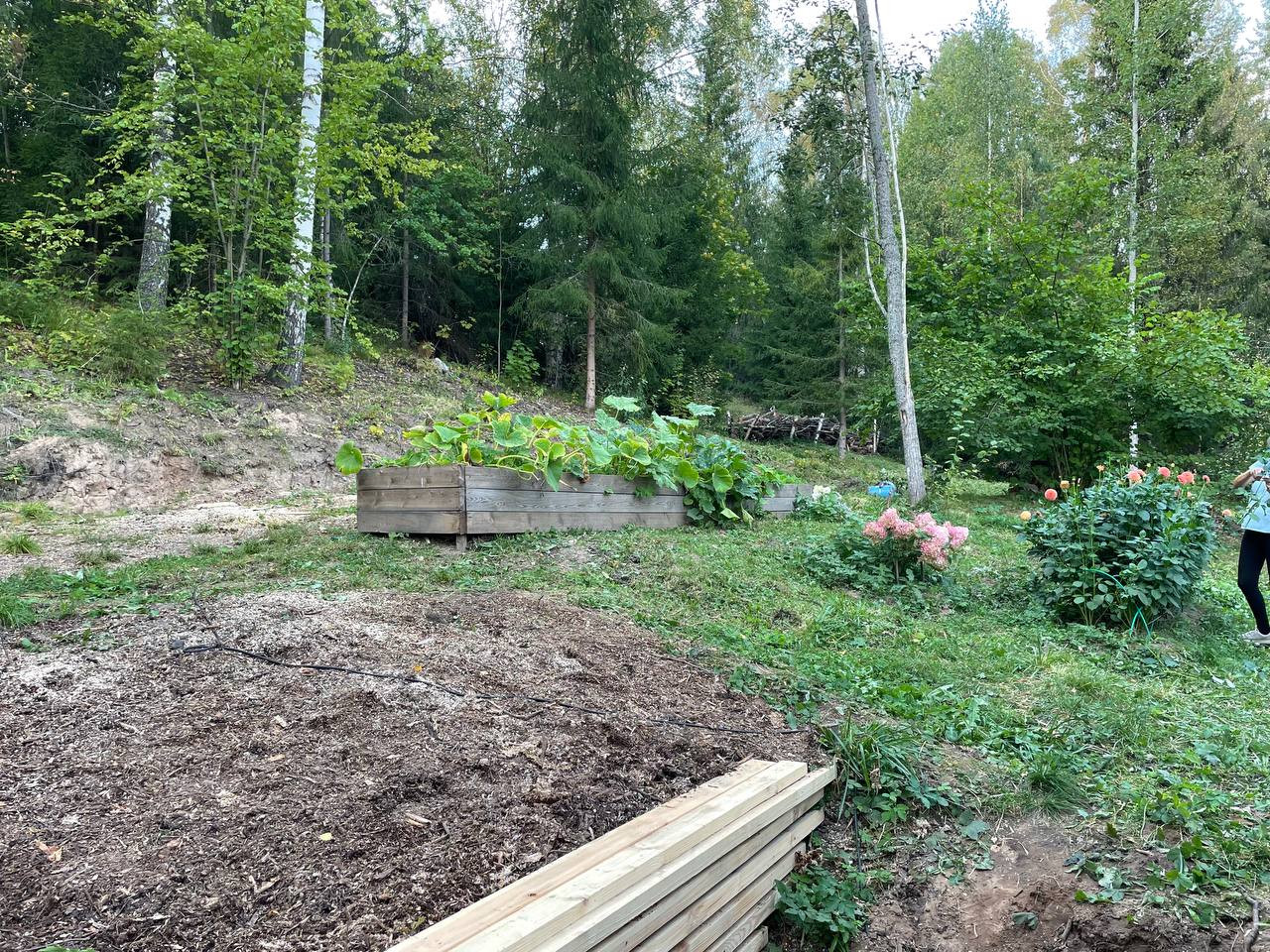 Участок разработан, посажены сортовые пионы и гортензии, весной распускается множество луковичных первоцветов (розовые мускари, сортовые нарциссы, тюльпаны).