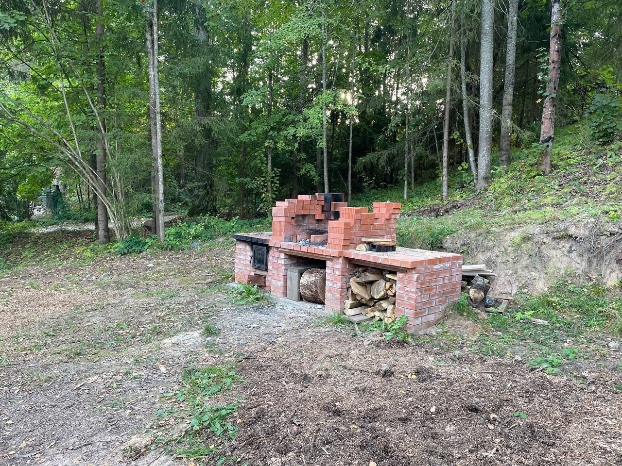 Рядом с домом размещена зона барбекю с печью и мангалом. Устроены места отдыха под раскидистым орешником.