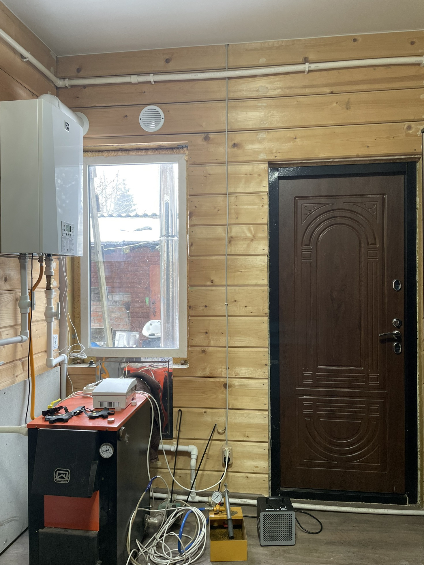 Отопление - газ и твердотопливный котел.