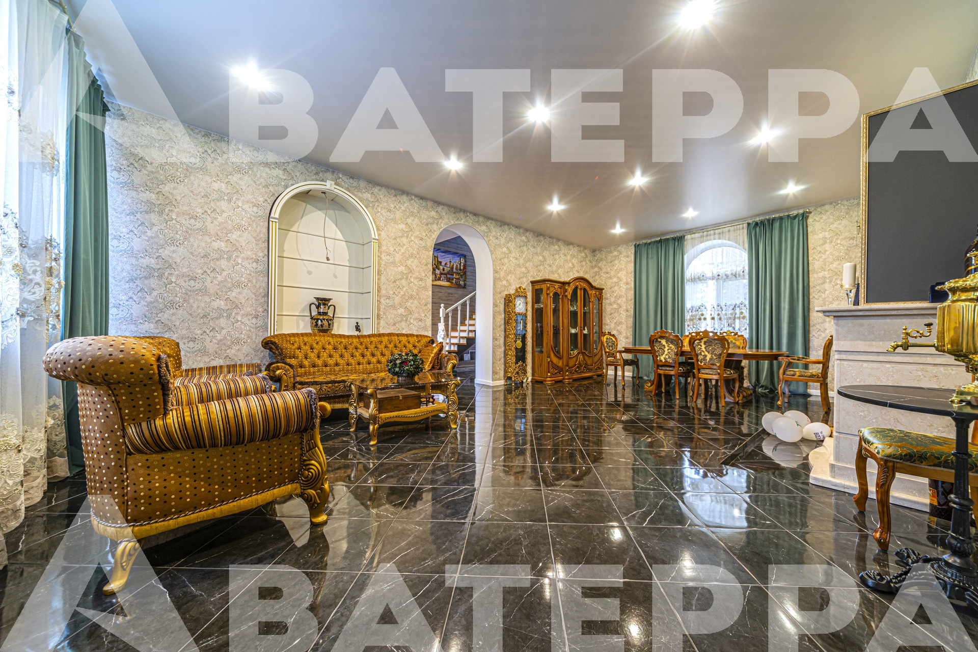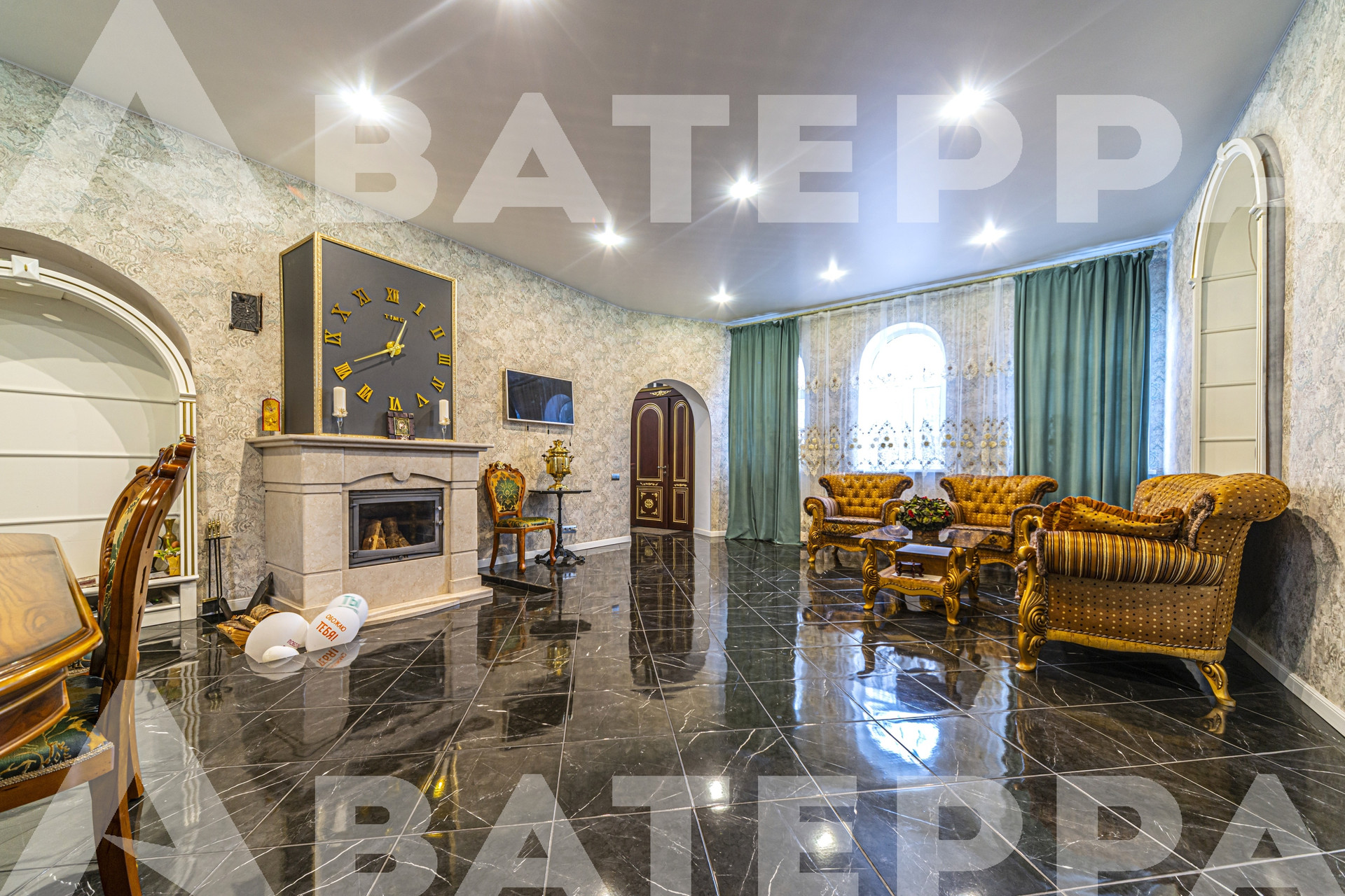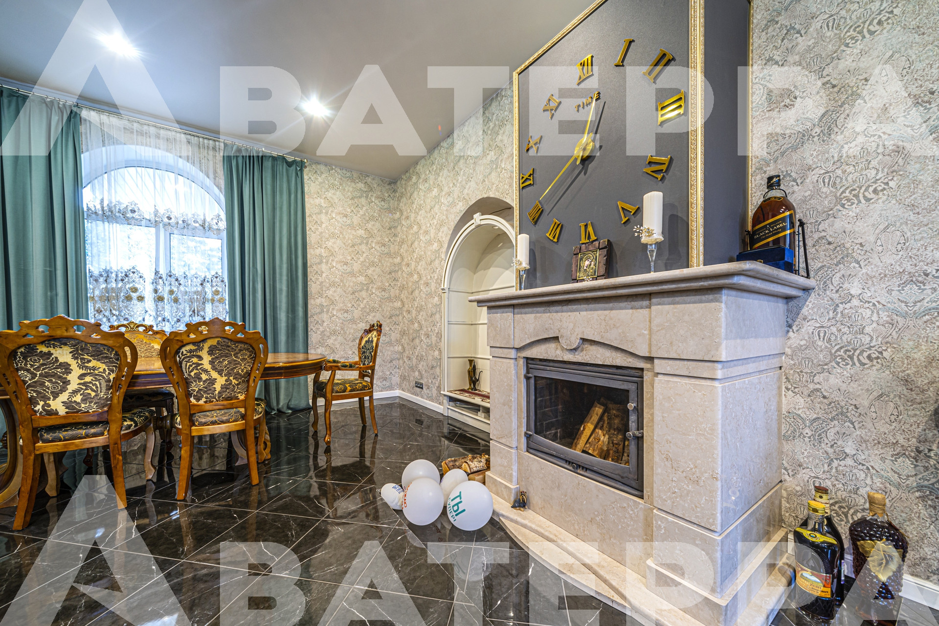 1 этаж: кухня, обеденный зал с искусственным камином, гостиная 50 м2 с настоящим камином и мраморным полом, гостевой туалет, прачечная, просторная прихожая и запасной выход. На всём этаже теплые полы.