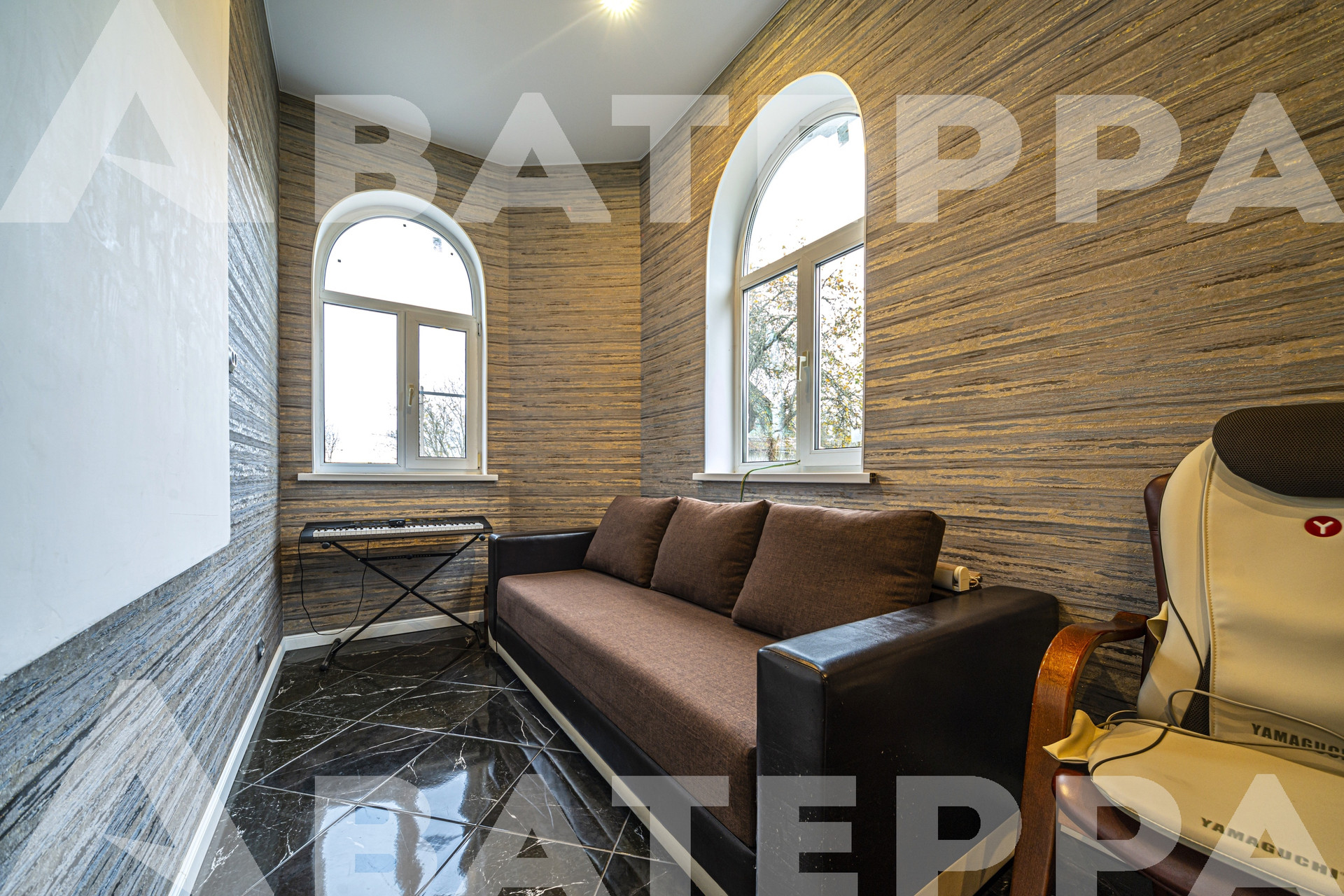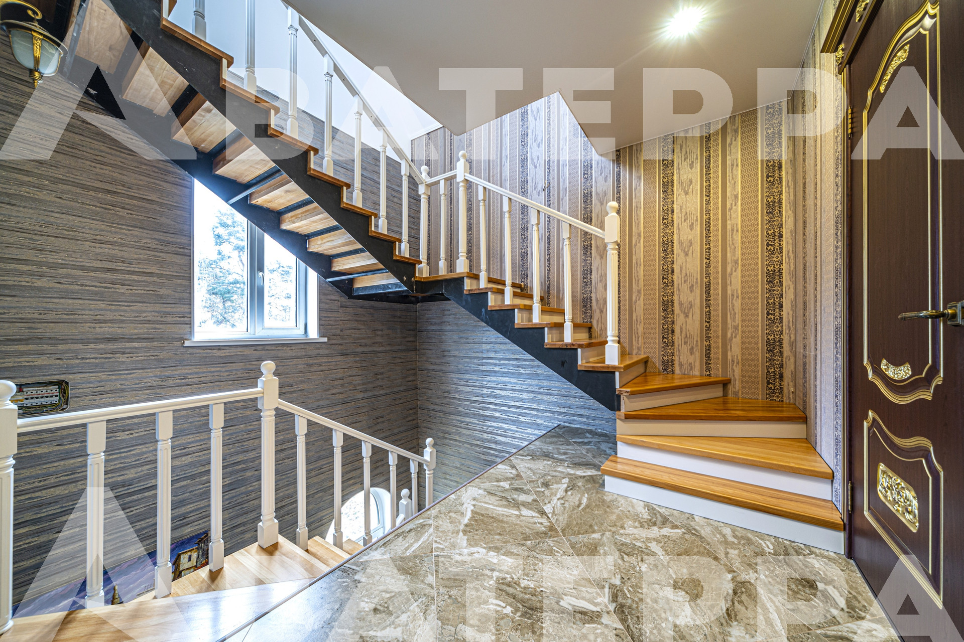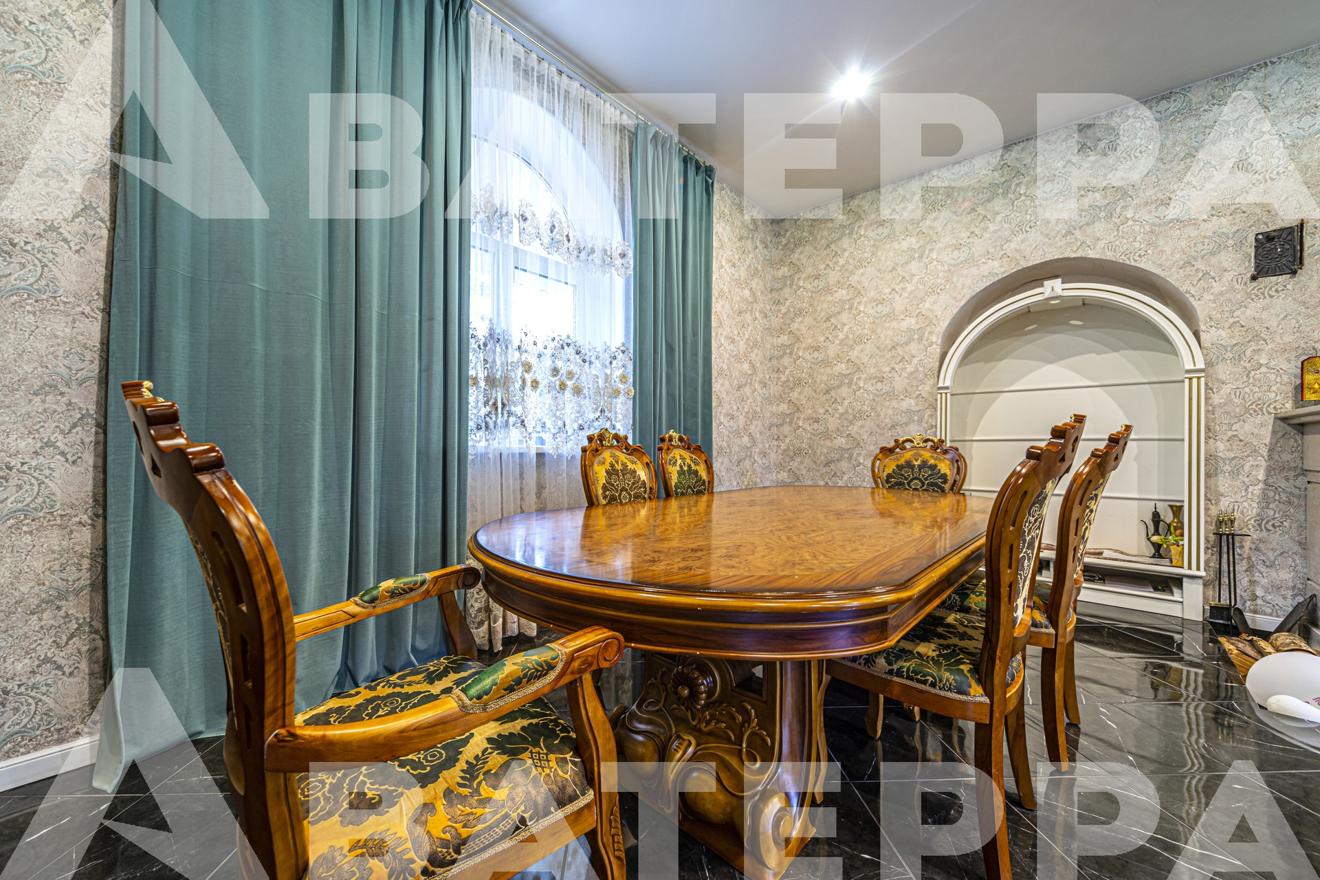 1 этаж: кухня, обеденный зал с искусственным камином, гостиная 50 м2 с настоящим камином и мраморным полом, гостевой туалет, прачечная, просторная прихожая и запасной выход. На всём этаже теплые полы.