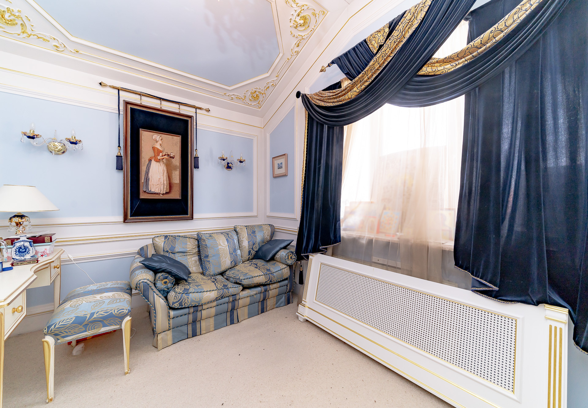 Строительство началось в 1998 году по индивидуальному проекту хозяина. Дом, по сути, является произведением искусства. Каждая комната - неповторима. В интерьере преобладает дворцовый стиль с богатой лепниной на стенах и потолках, позолотой на декоративных элементах, резными лестницами и полами из мрамора. Классические элементы декора органично сочетаются с современными технологиями.