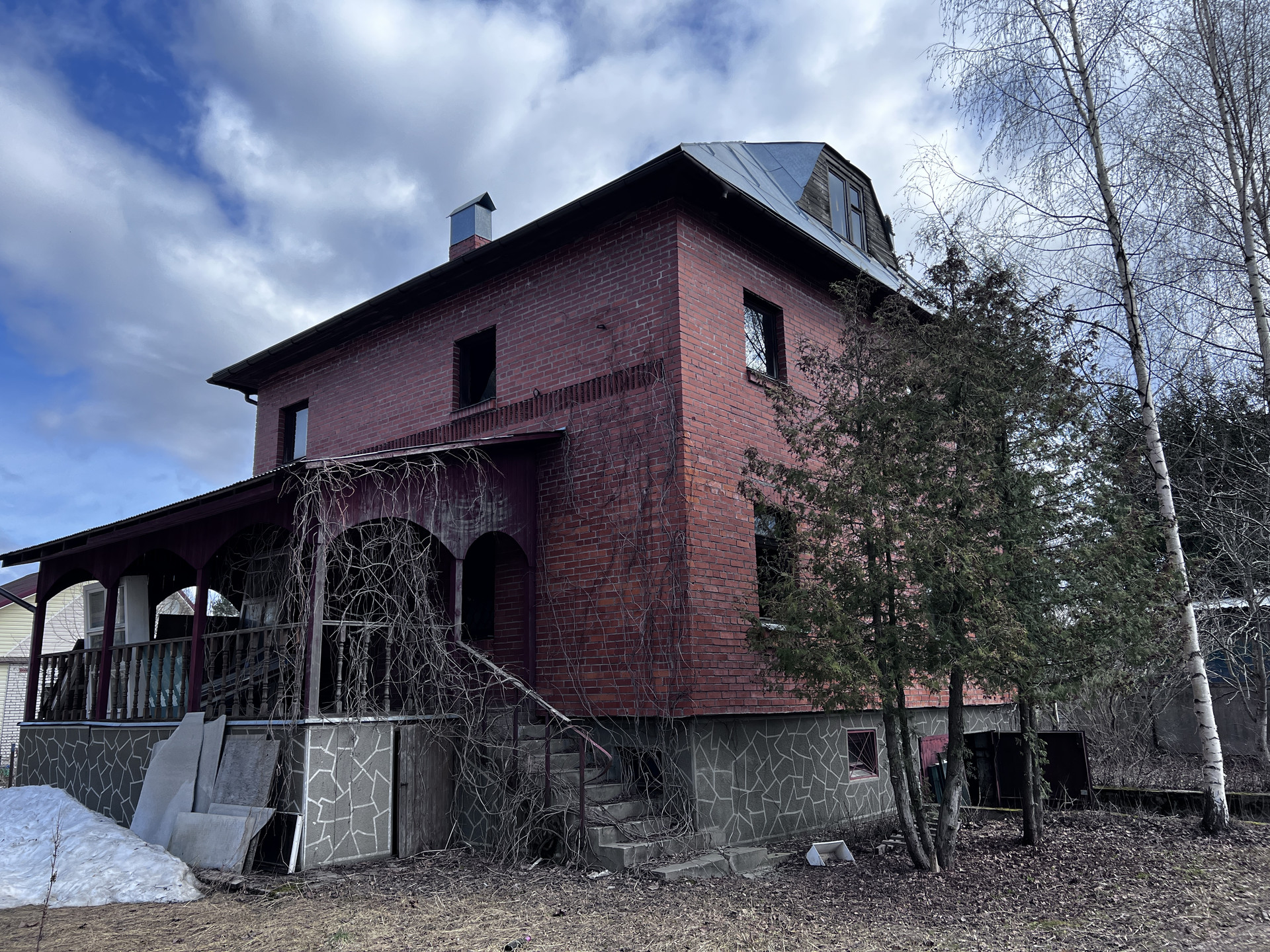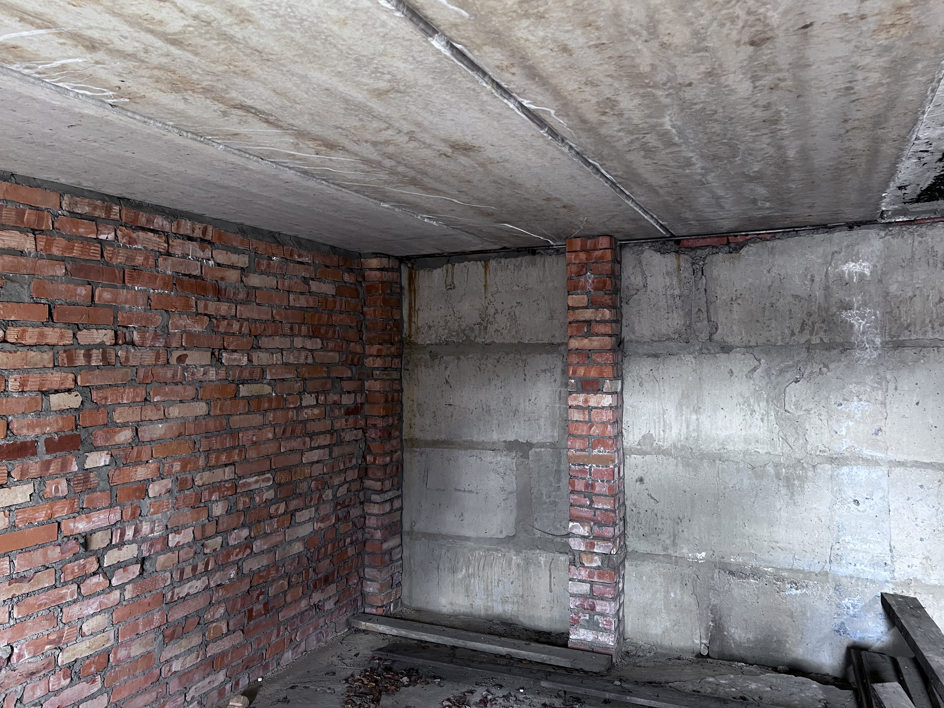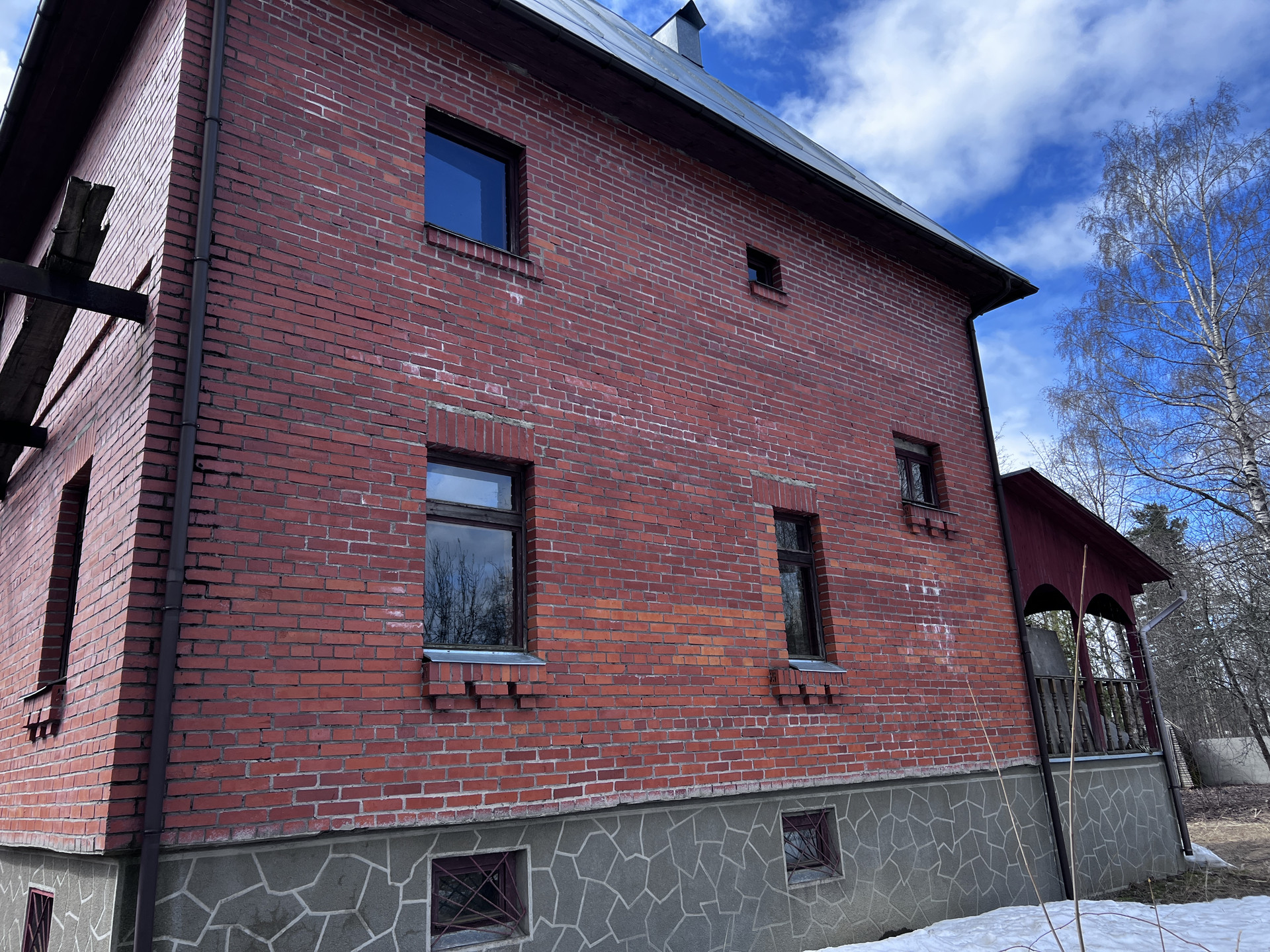 Фундамент-плита, дом построен из красного кирпича, межэтажные перекрытия железобетонные.