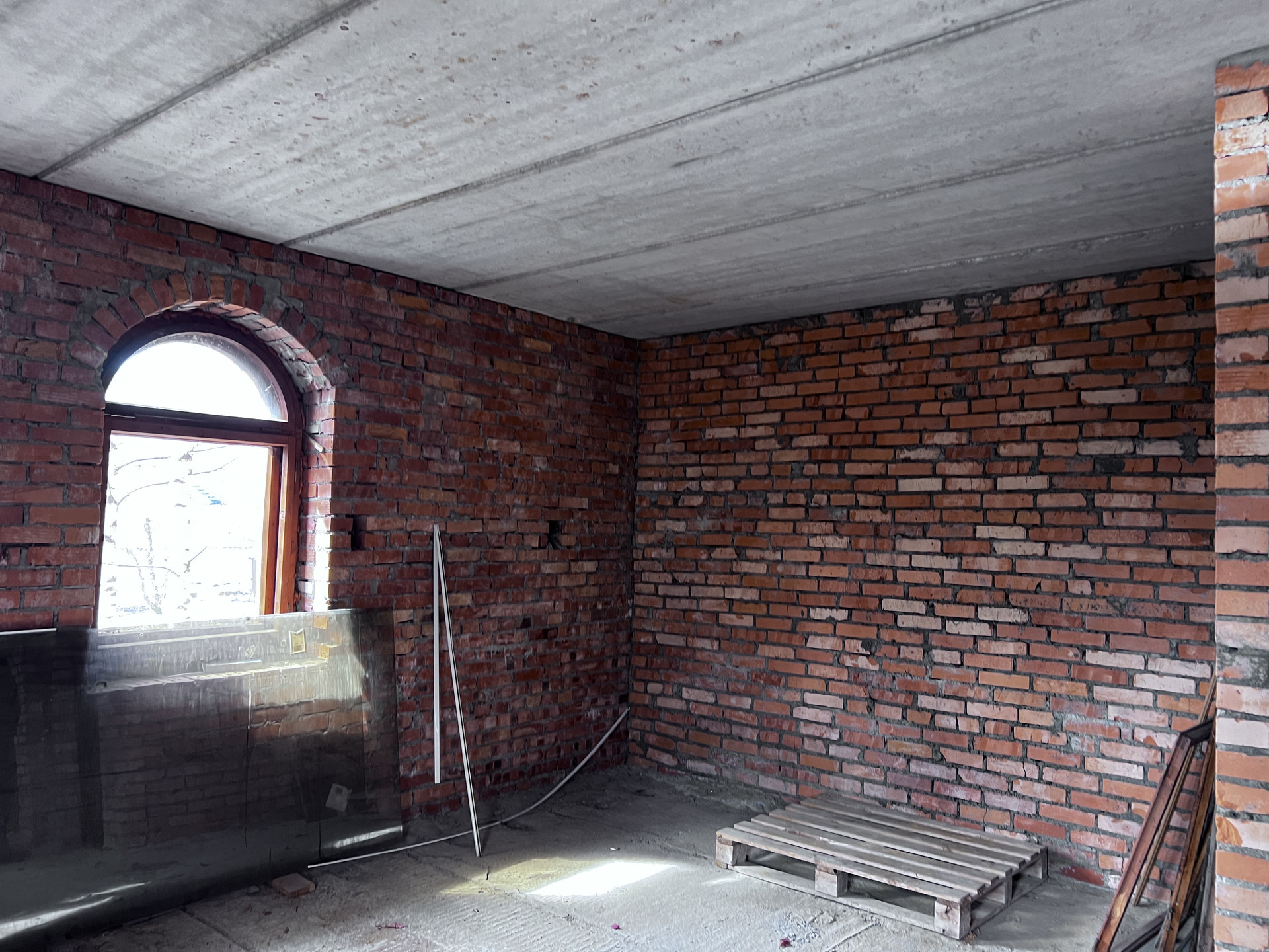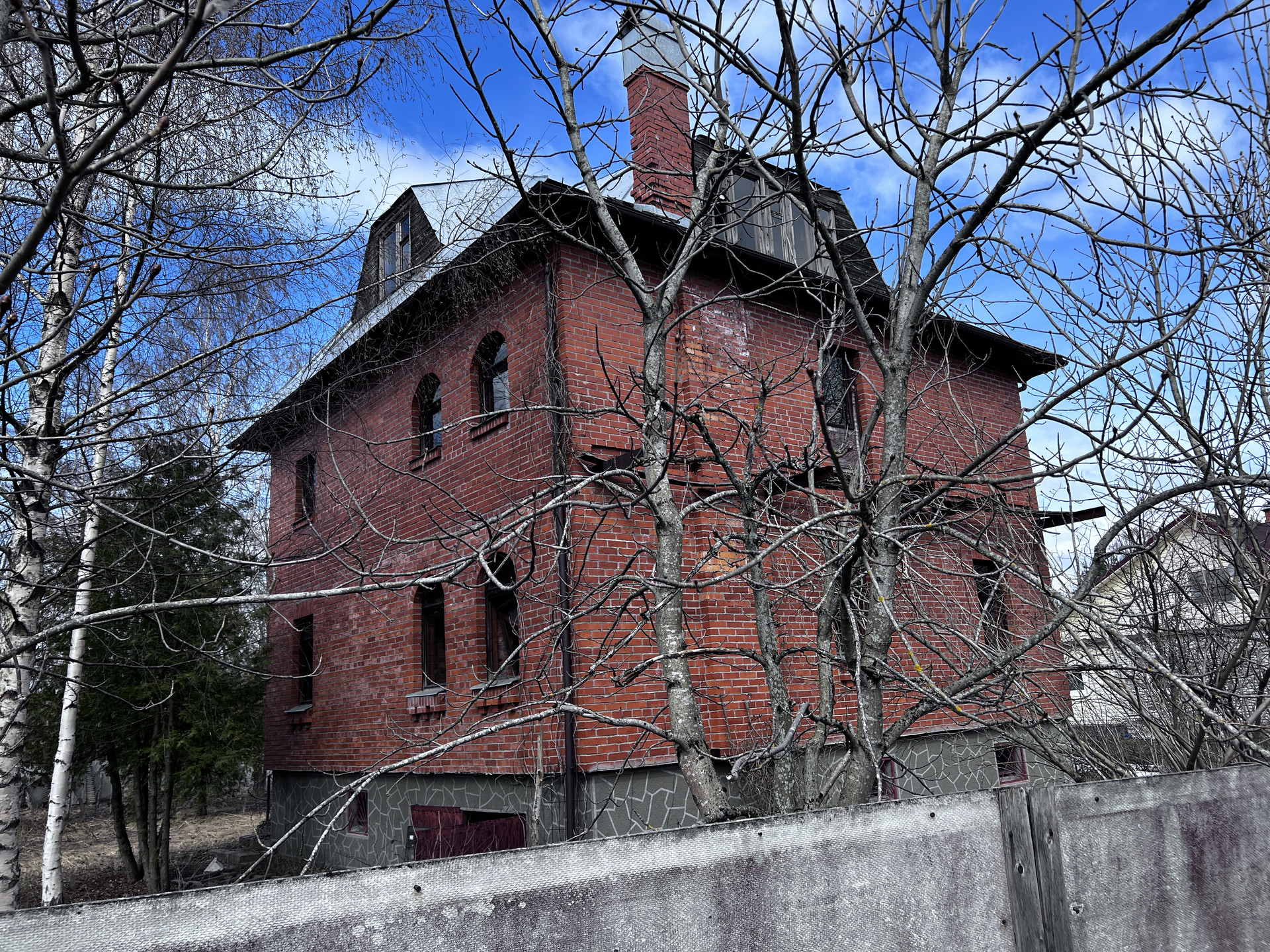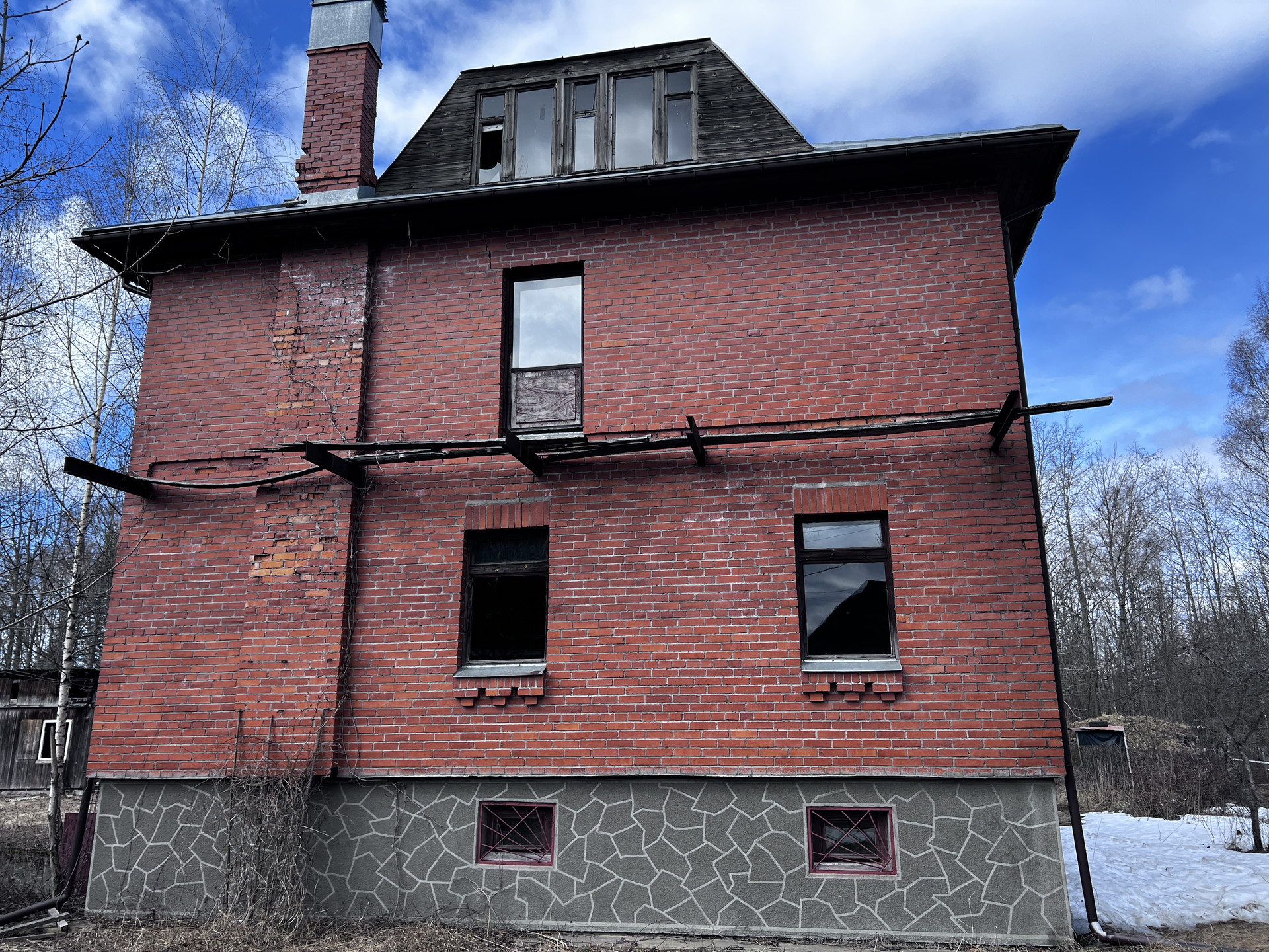 Фундамент-плита, дом построен из красного кирпича, межэтажные перекрытия железобетонные.