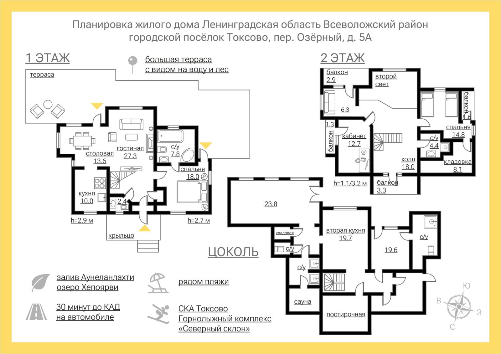 - в 5-ти минутах, несколько школ и детских садов, фермерские хозяйства с натуральными продуктами, магазины, медицинский центр, озеро с благоустроенным пляжем, ГК «Северный склон», бассейн, лыжная база СКА.