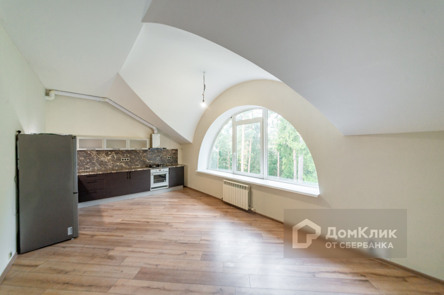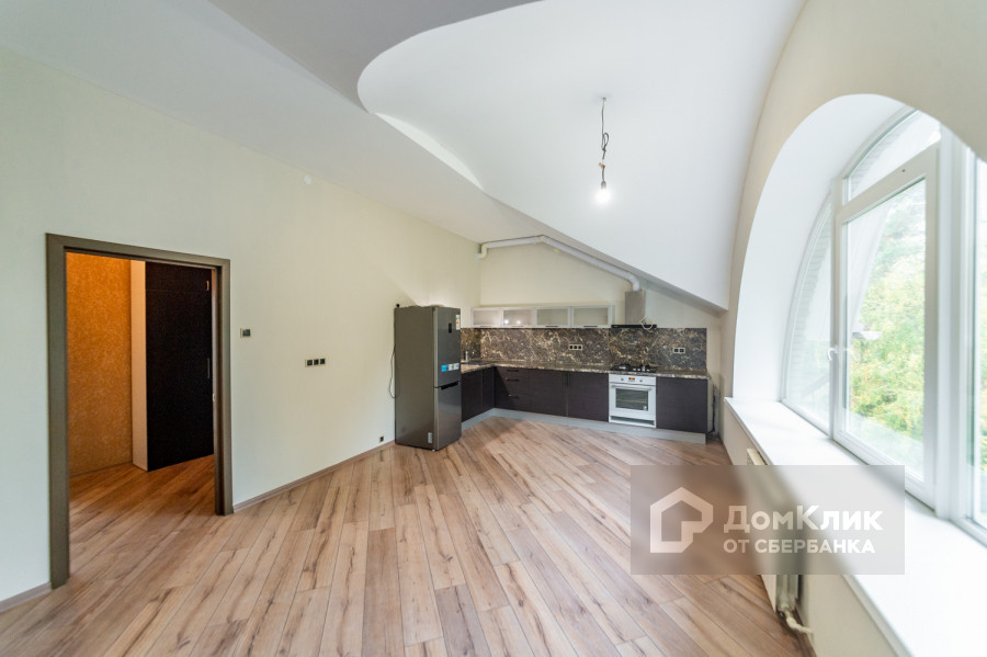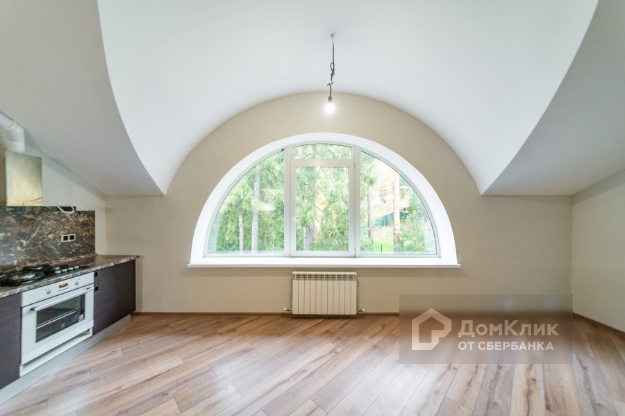 Квартира находится на четвертом этаже. Есть лифт. Выполнена полная чистовая отделка. Установлена кухонная мебель. Изюминкой данной квартиры являются огромные арочные окна.
