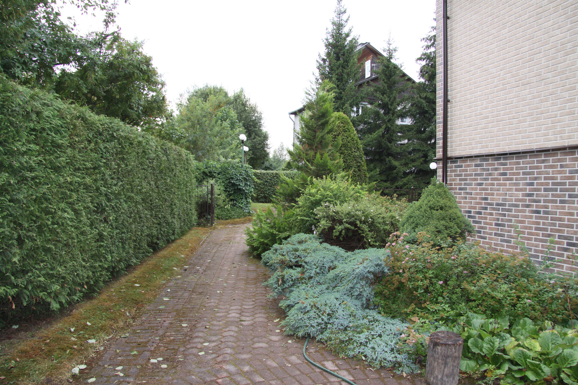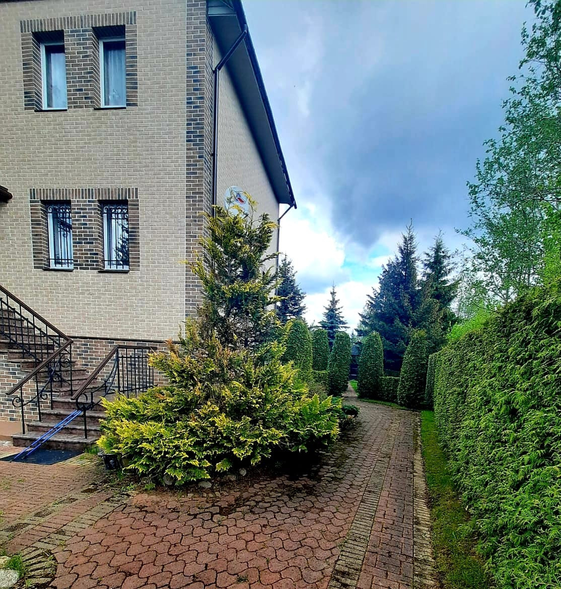 На участке 12 соток выполнен ландшафтный дизайн. Очень красивый ухоженный сад с многолетними туями, соснами, есть несколько плодовых деревьев, плодовые кусты, цветники.