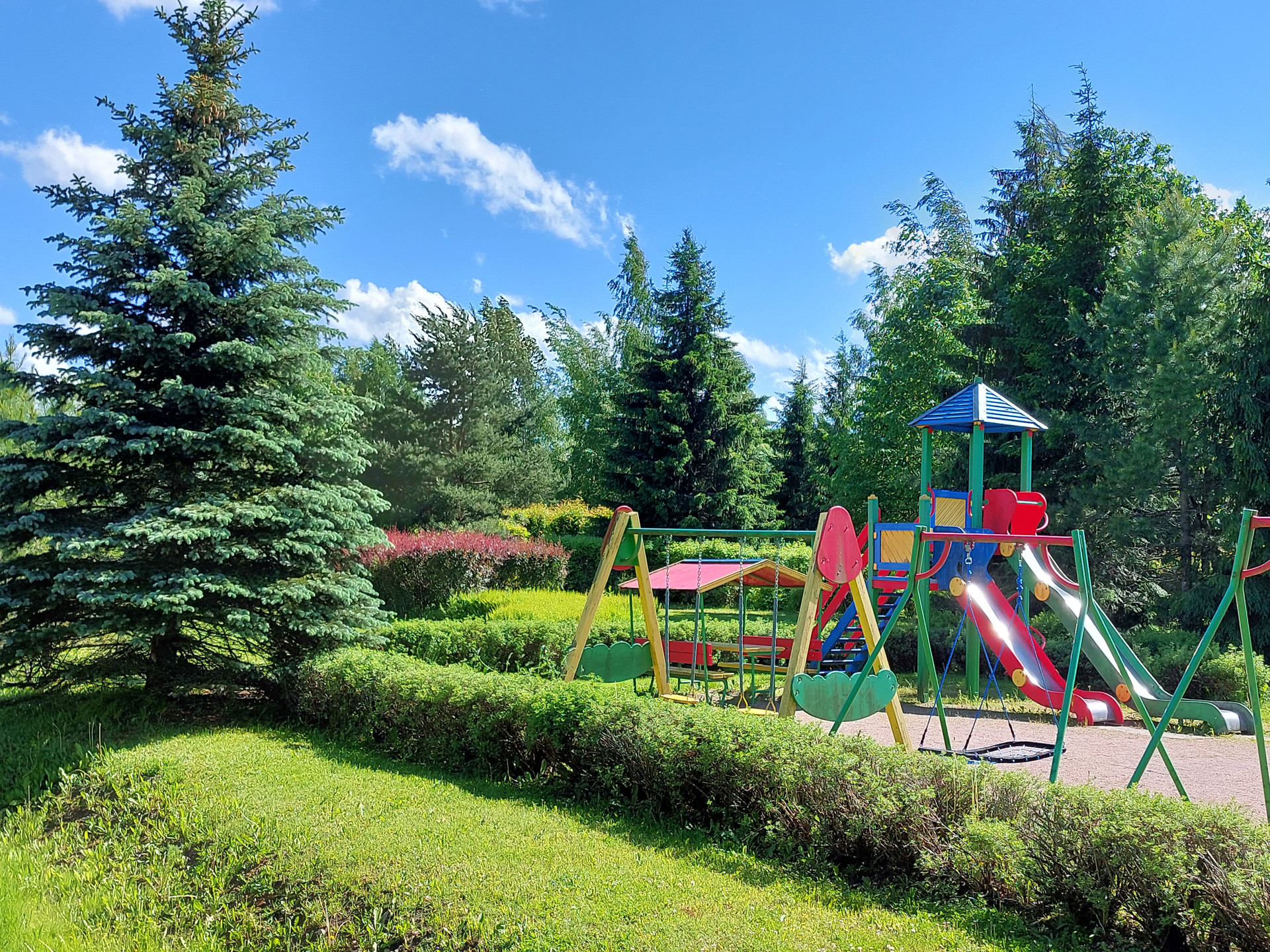 Участок с ландшафтным дизайном, с редкими видами деревьев и фигурно подстриженными кустарниками. Беседка для отдыха.
