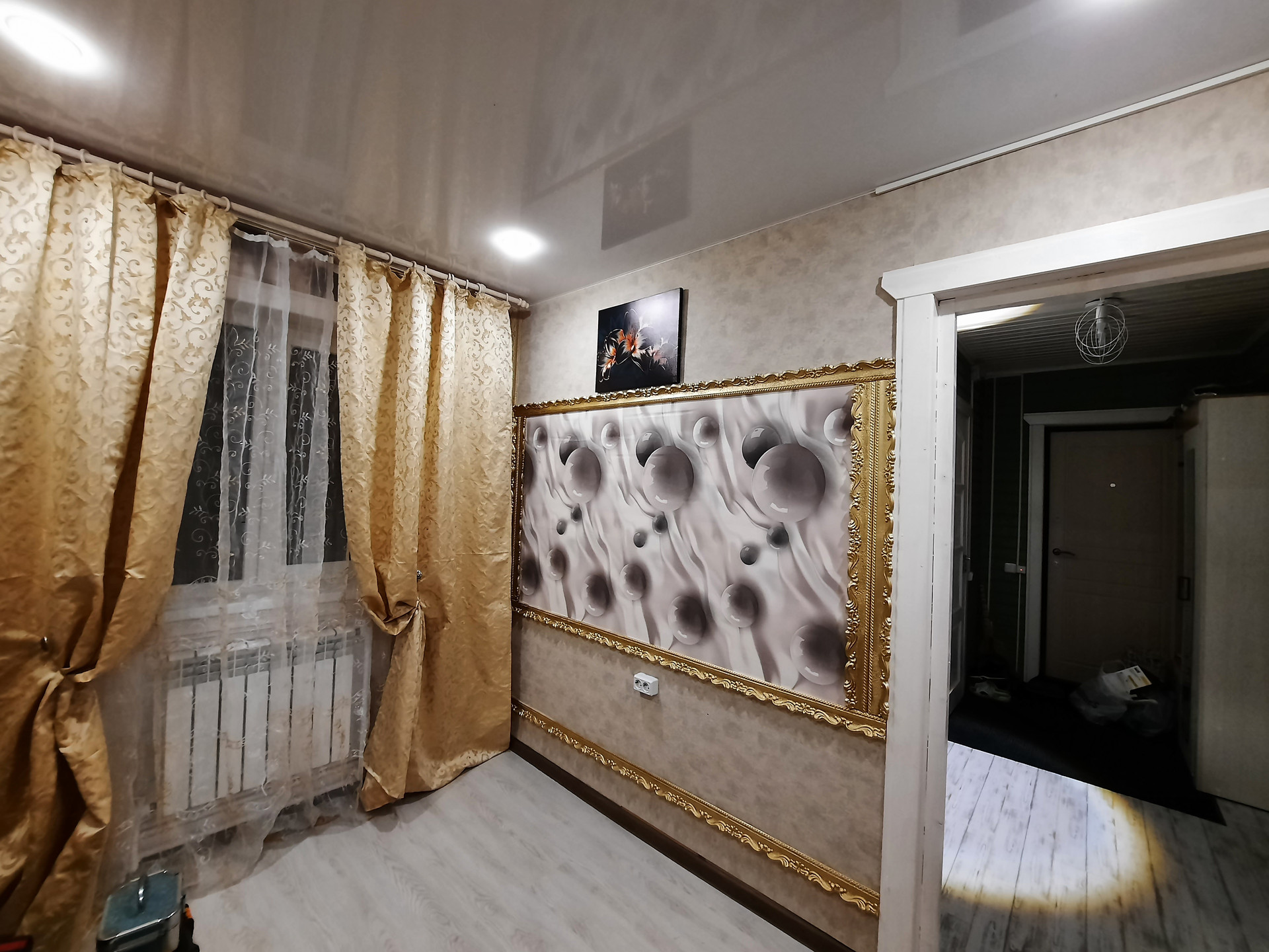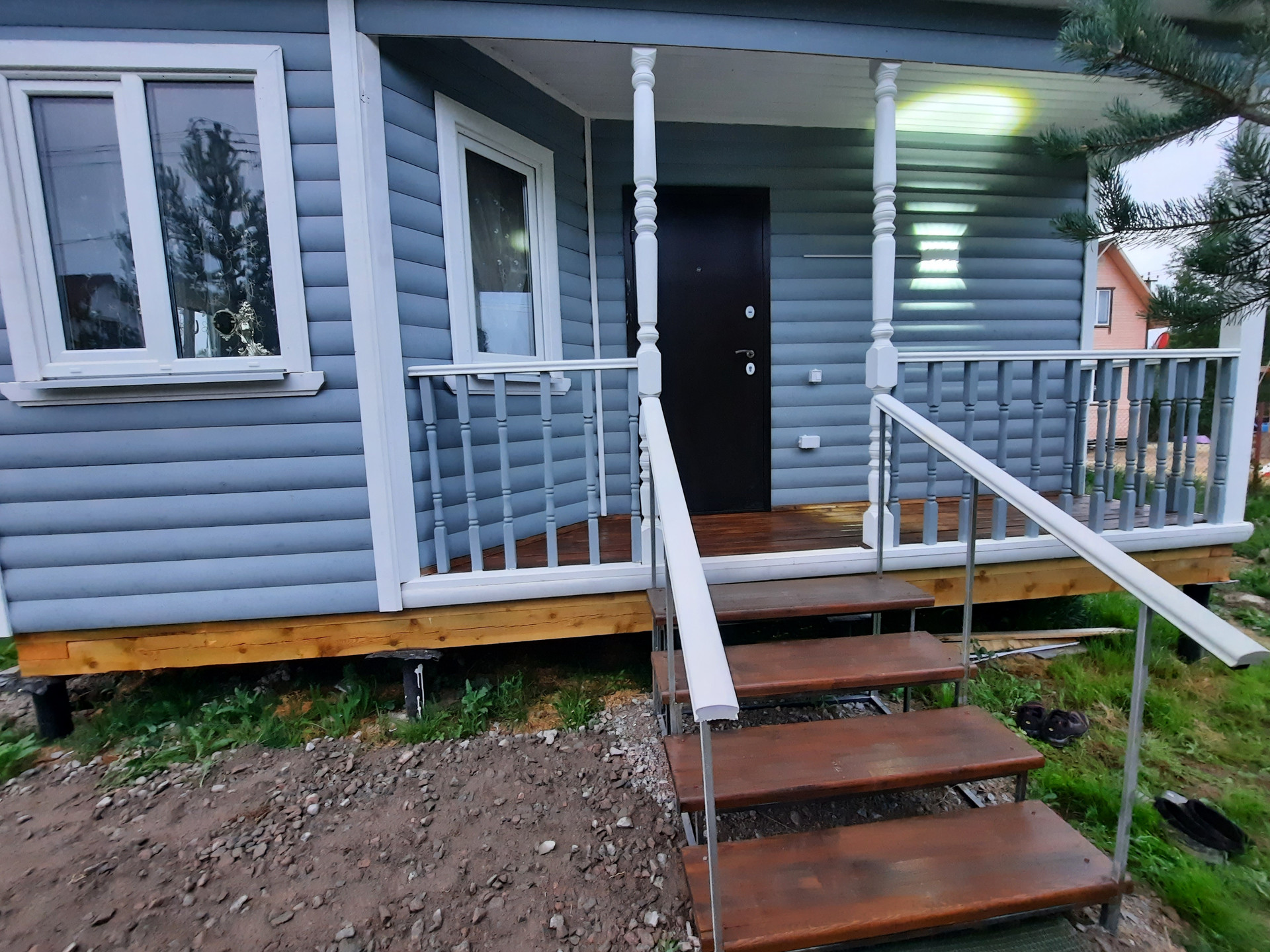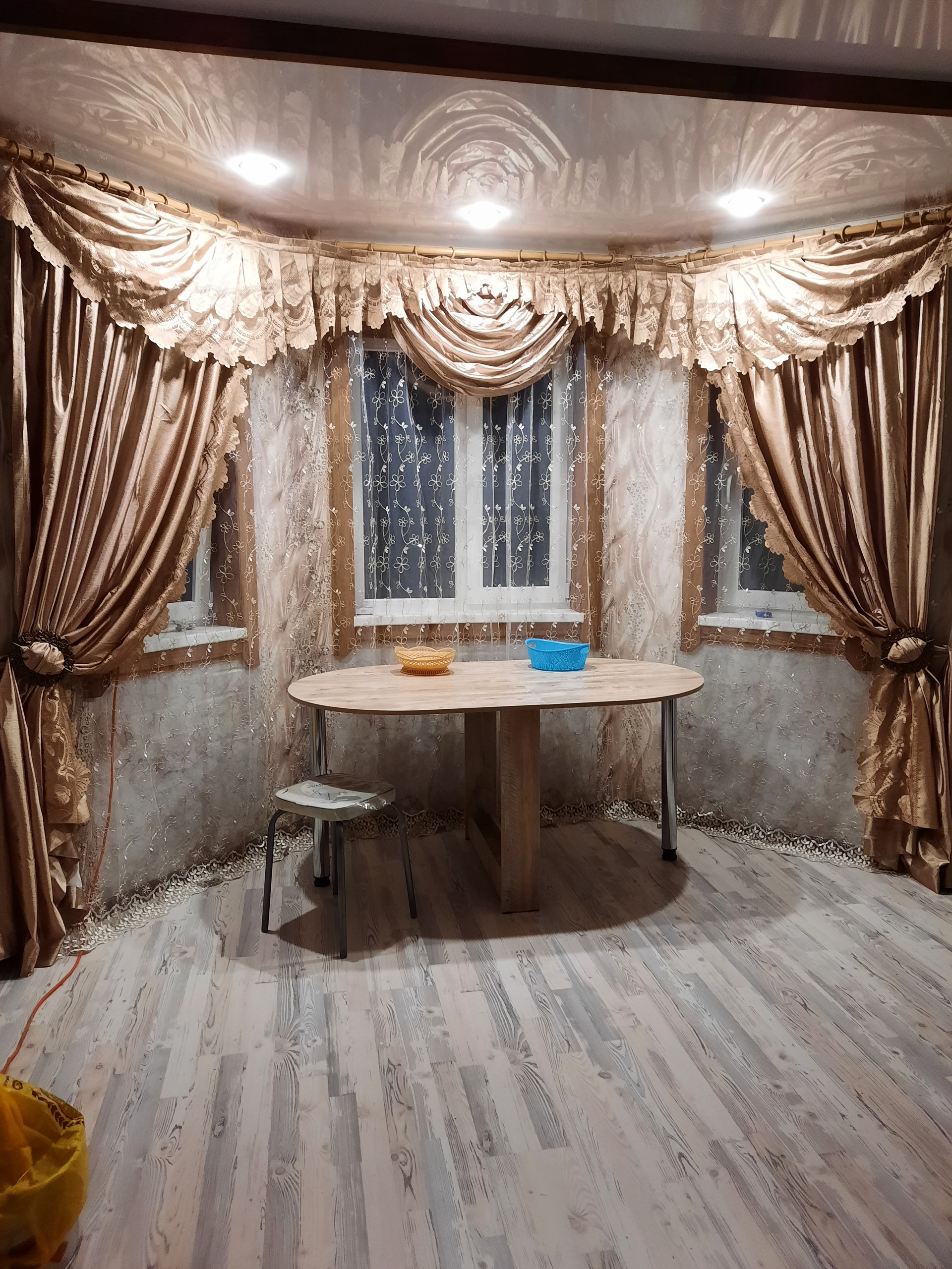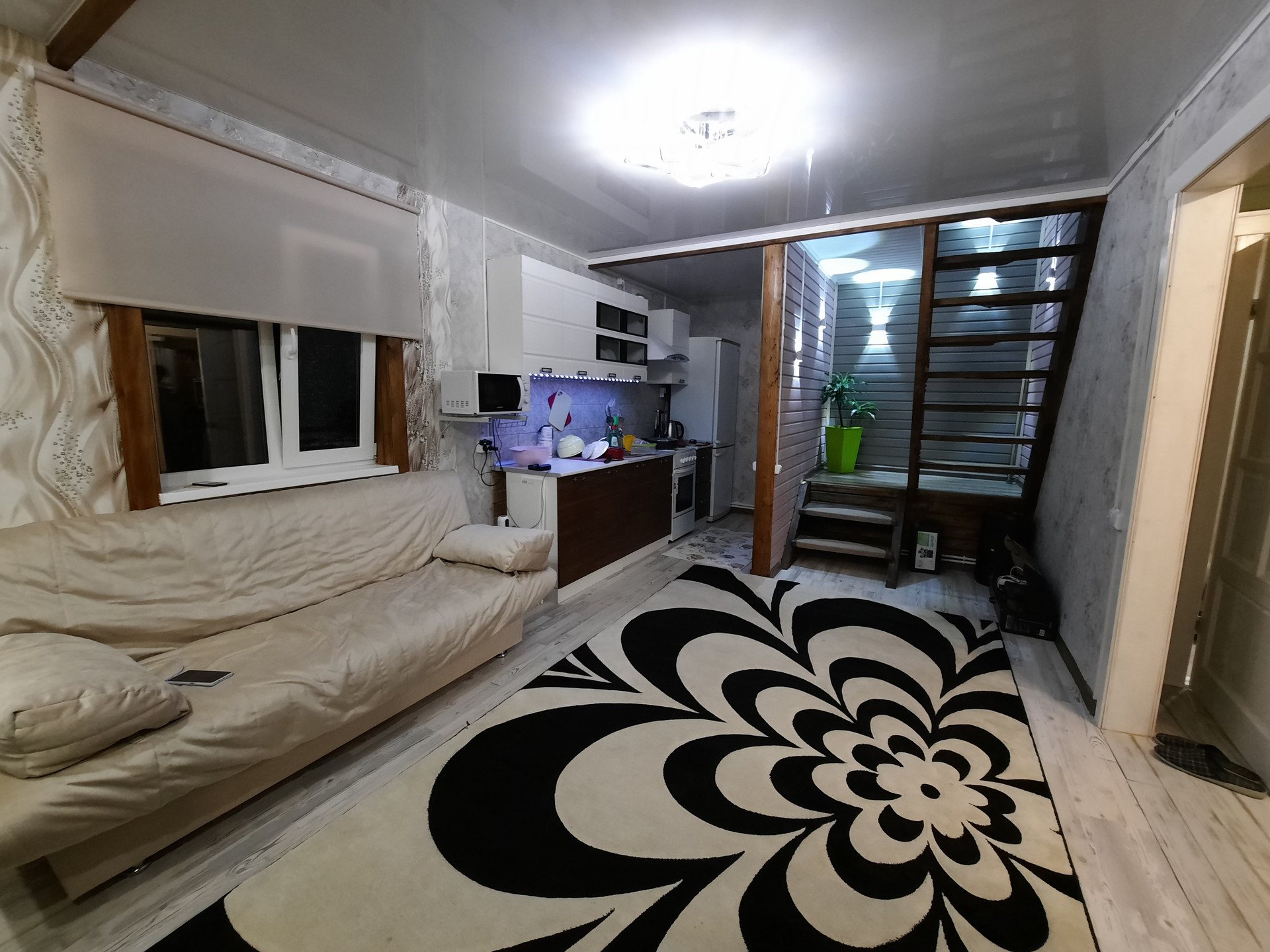 Полы ламинат, плитка, потолки натяжные частично, мебель новая вся. На участке остаётся бытовка.