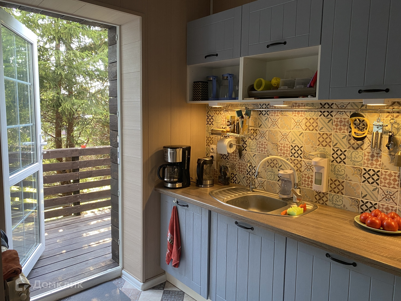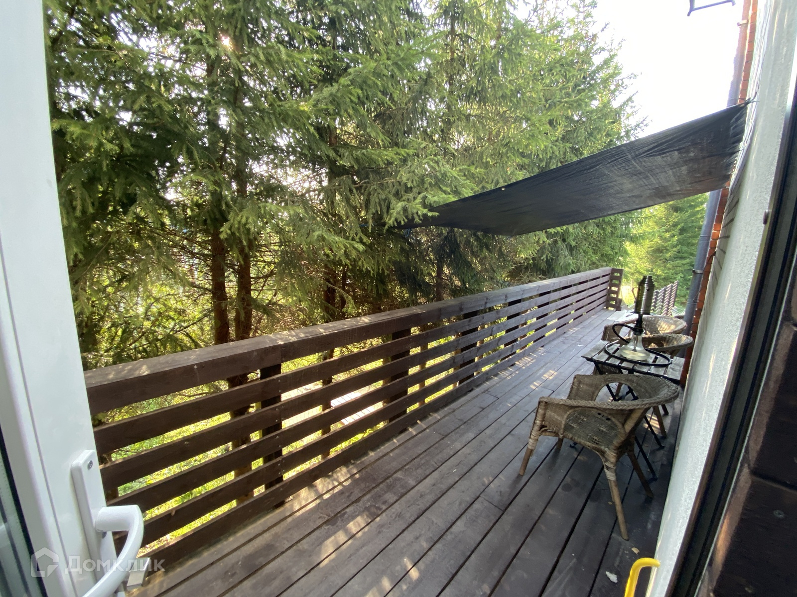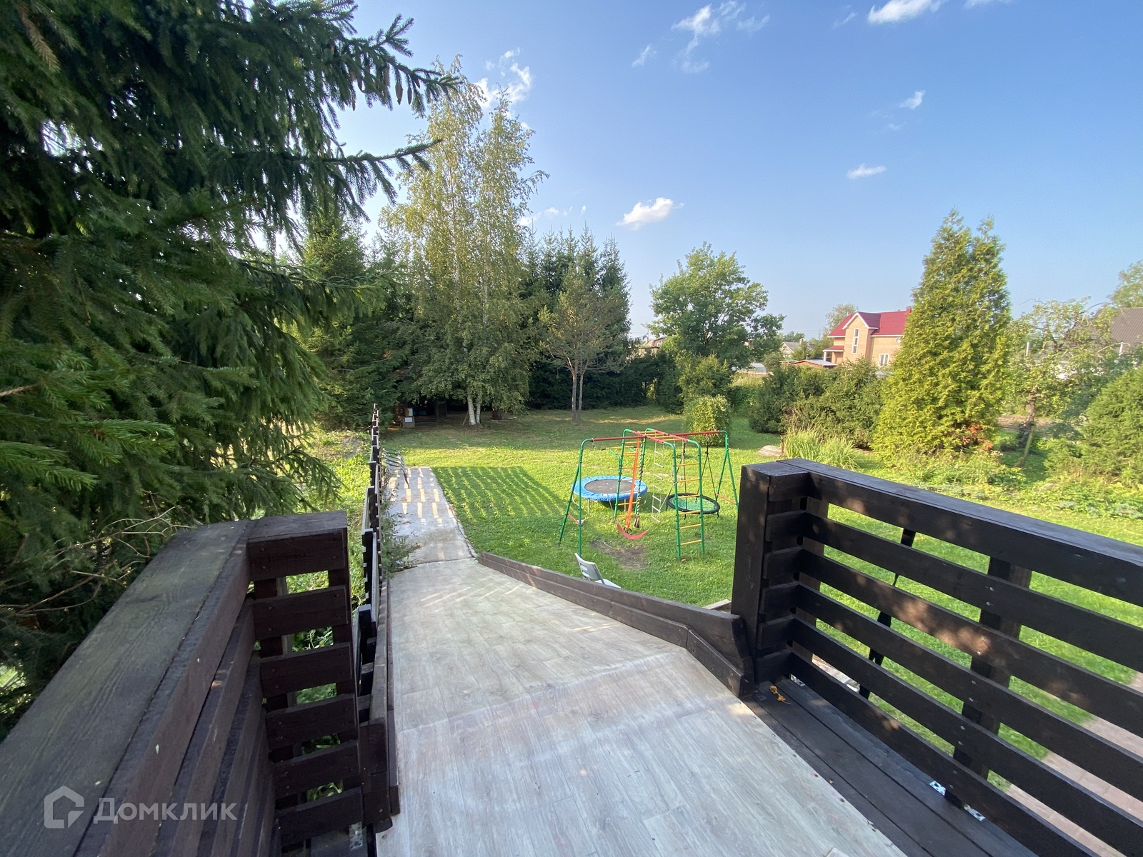Веранда первого этажа заканчивается детской горкой. На участке расположен детский игровой комплекс.