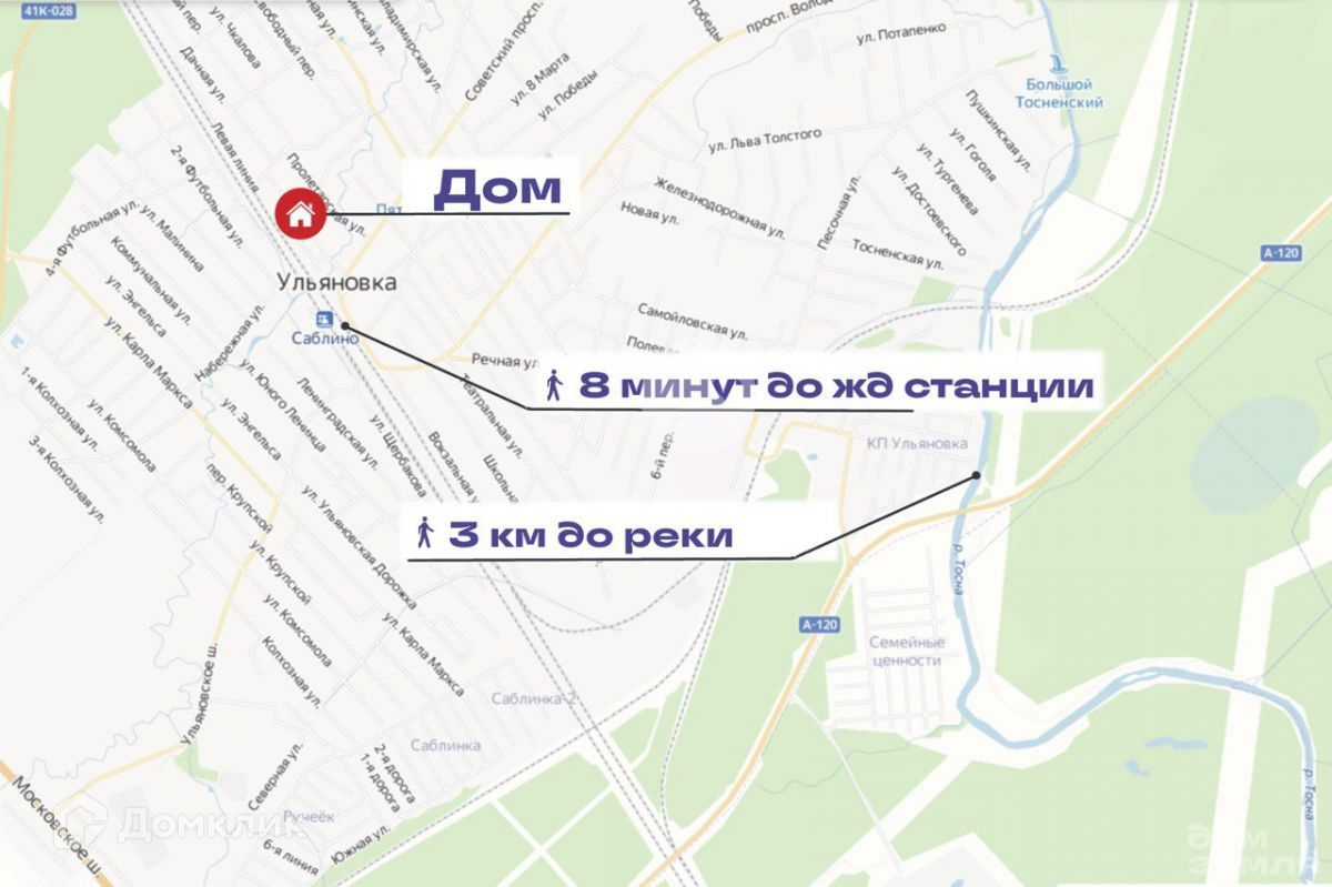 Удобное транспортное сообщение: 40-50 мин. по Московскому шоссе на машине до м. Купчино, м. Звёздная. От дома 8 минут пешком до ж/д станции "Саблино", электричка каждые 15- 30 мин. До Московского вокзала на электричке 30 минут. До г .Колпино и г. Тосно 20 минут на машине.