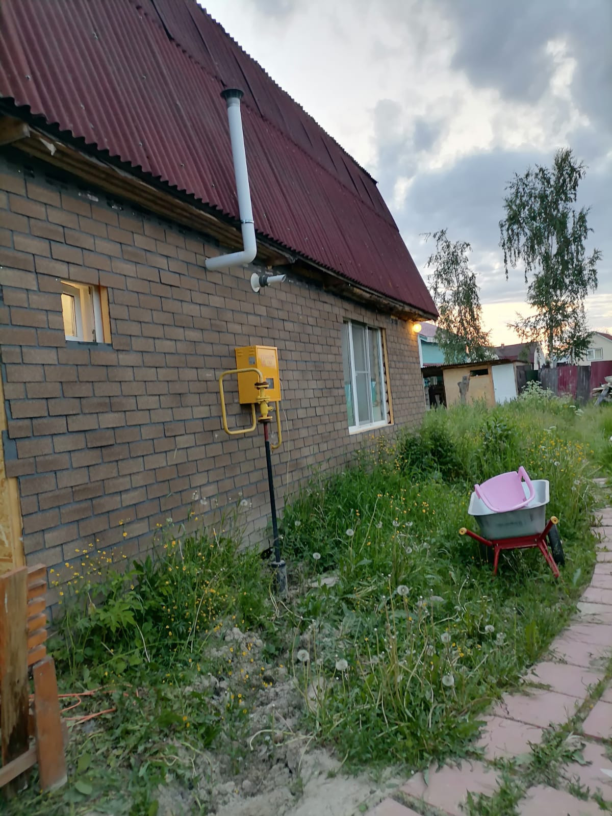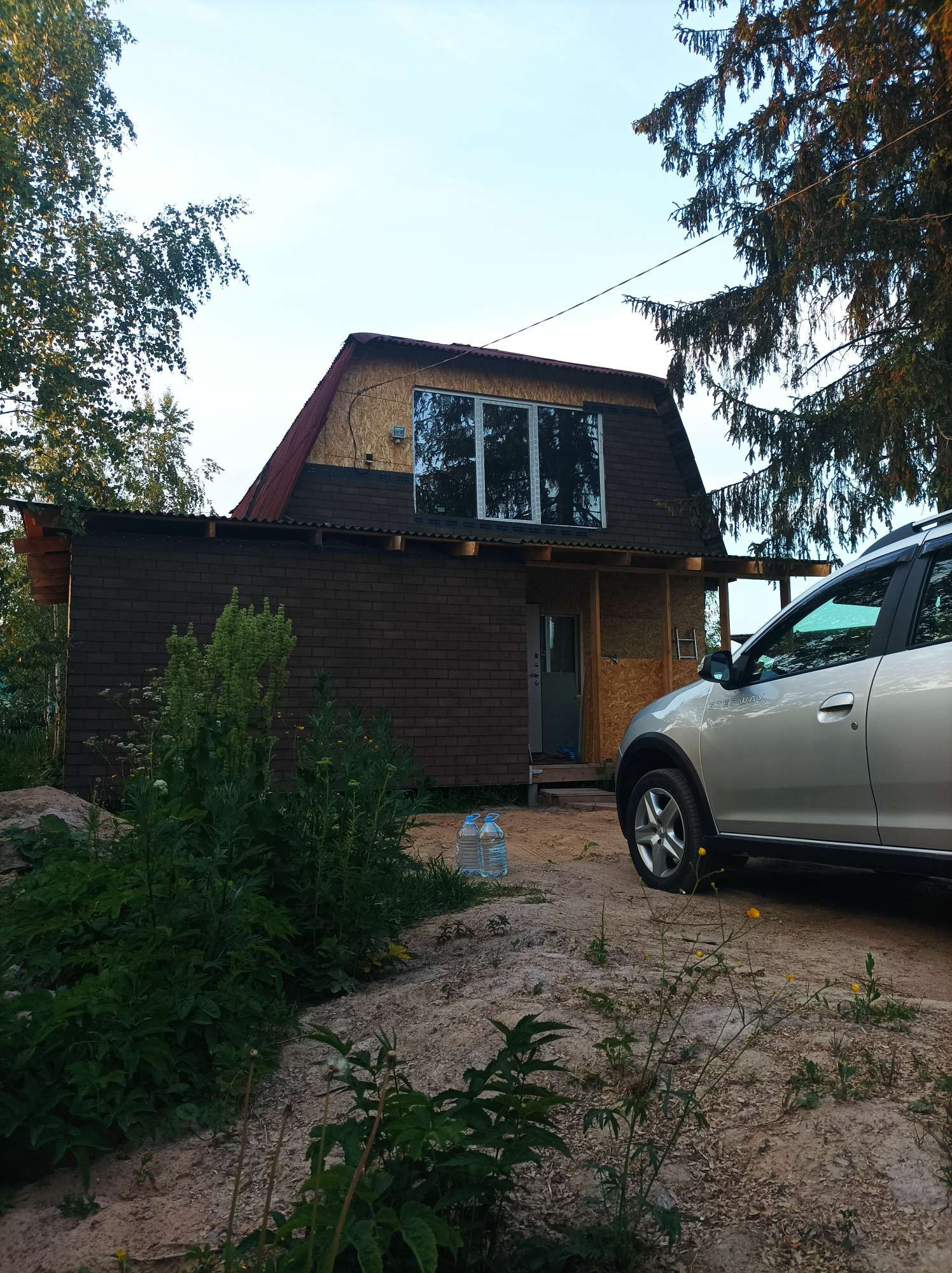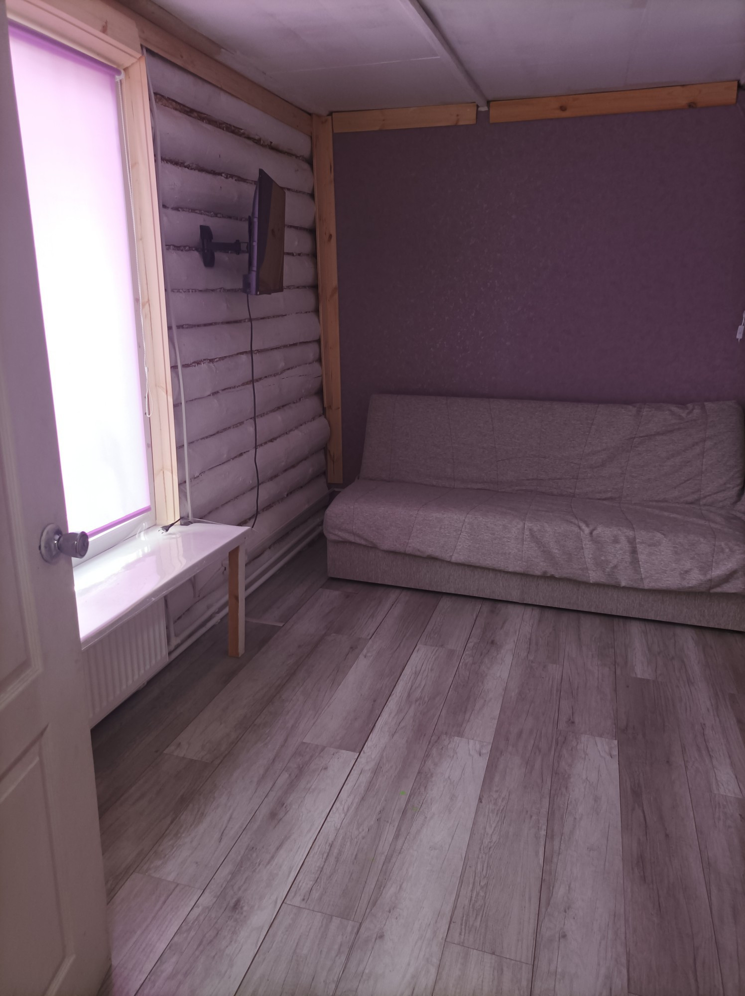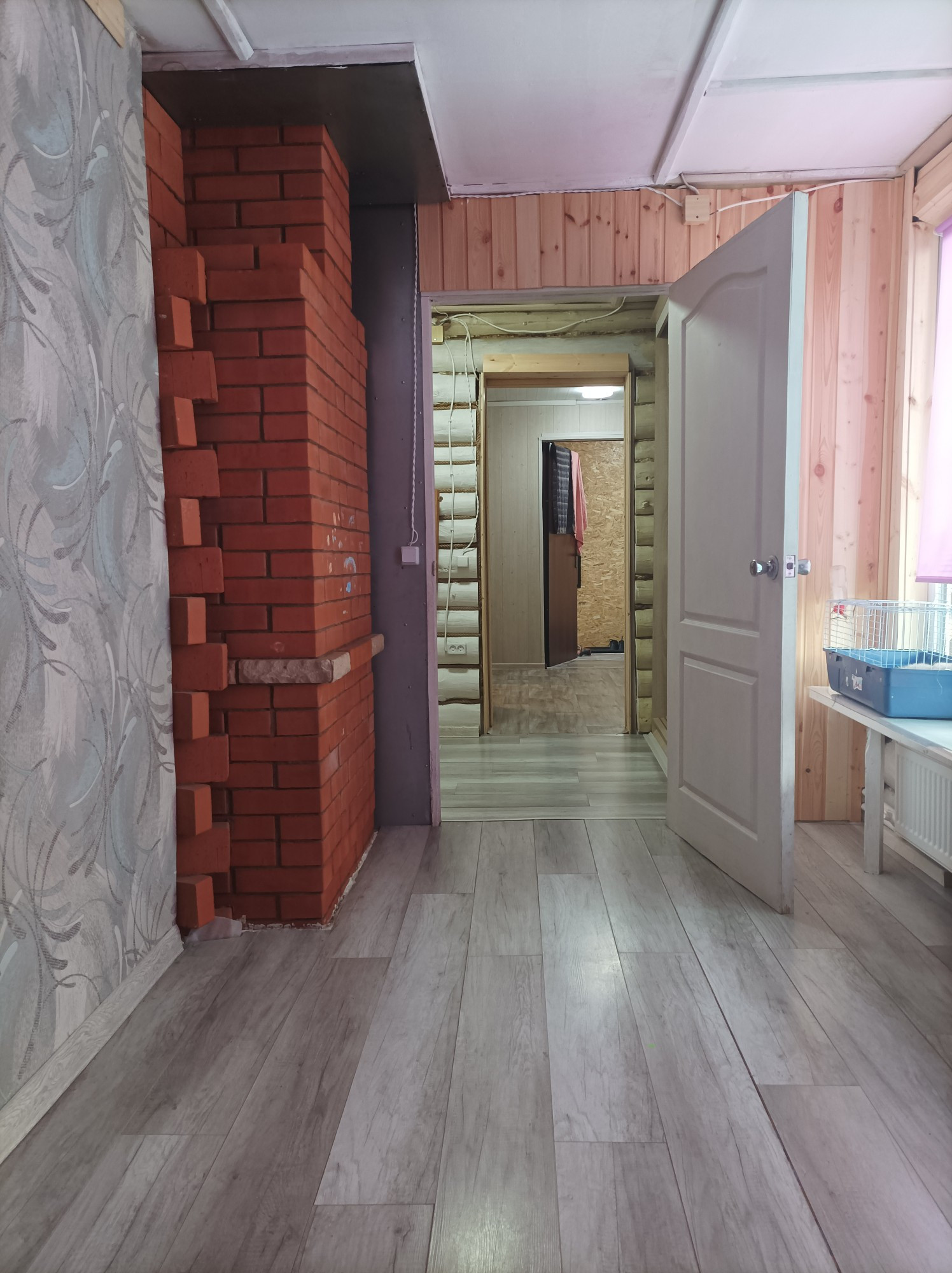 В маленькой комнате планировалось разместить лестницу на 2й этаж. Второй этаж делать не начали. Дом абсолютно и совершенно подходит для круглогодичного проживания и за счёт второго этажа можно увеличить его площадь (добавить 2-3 комнаты, по желанию). Работа в Санкт-Петербурге внезапно закончилась и новую предложили только в другом регионе, поэтому, в связи с переездом, не успели доделать облицовку дома качественным декоративным материалом, но он остаётся новым владельцам. И стройматериалы для бани или др. тоже остались.