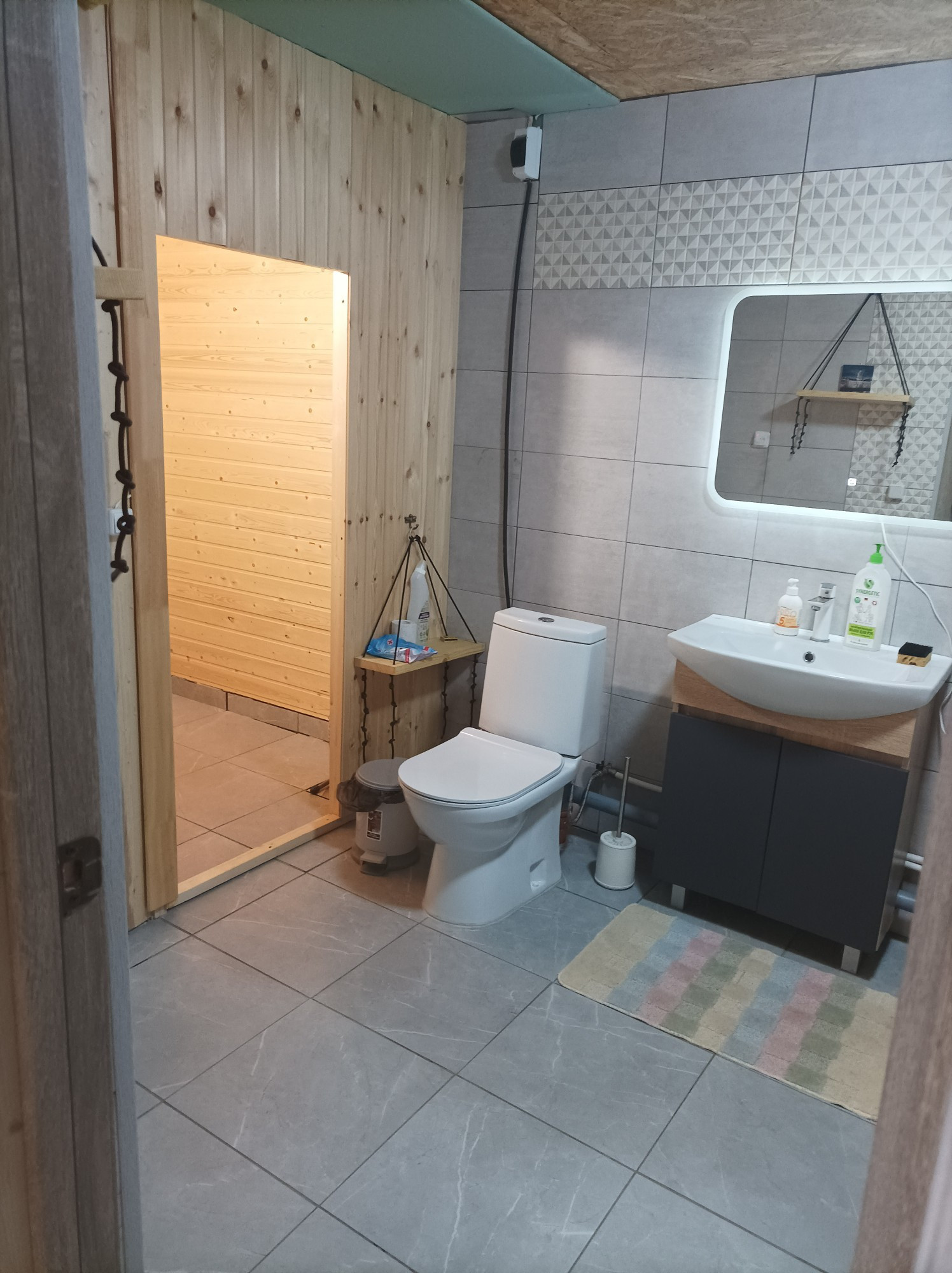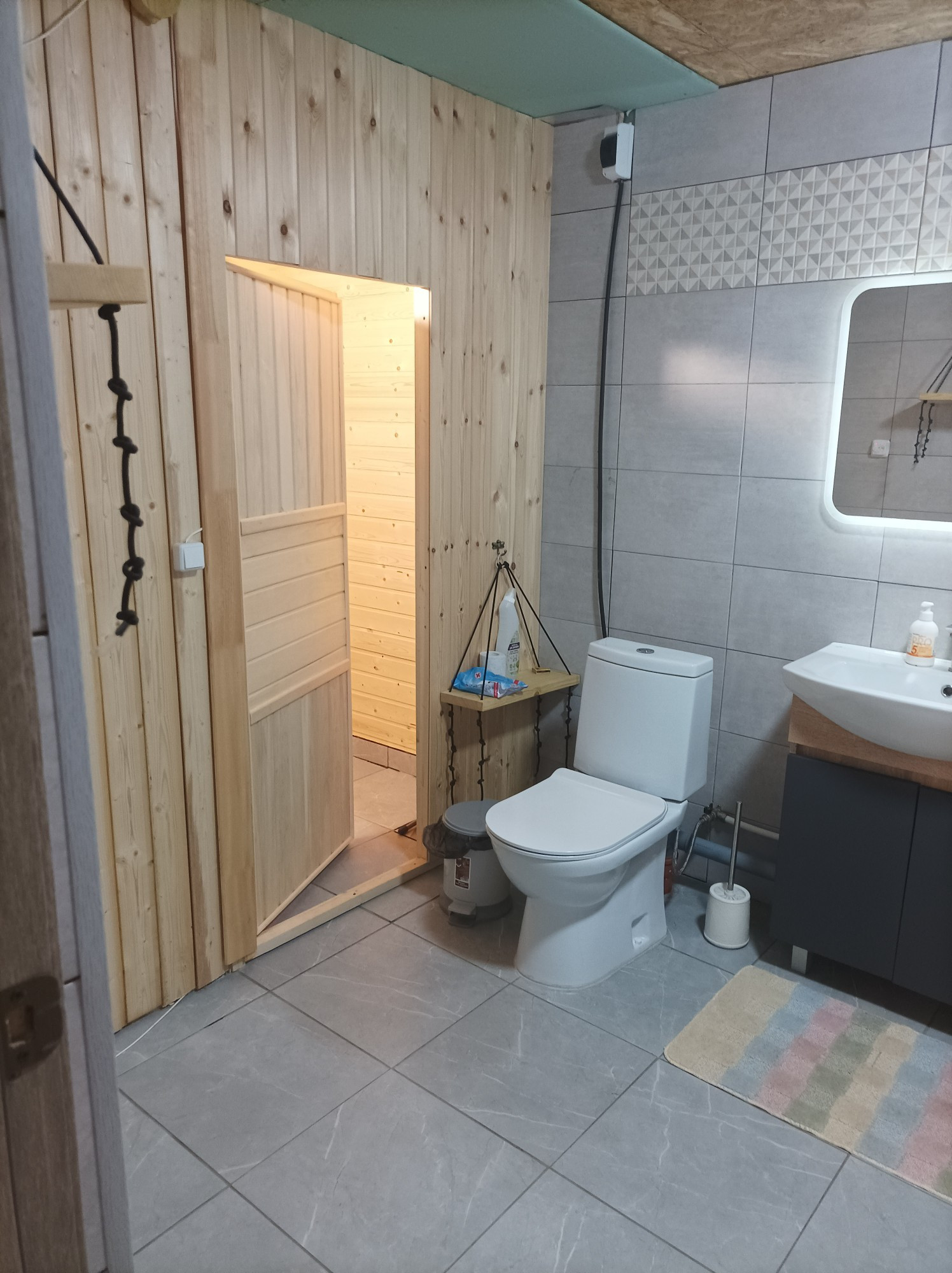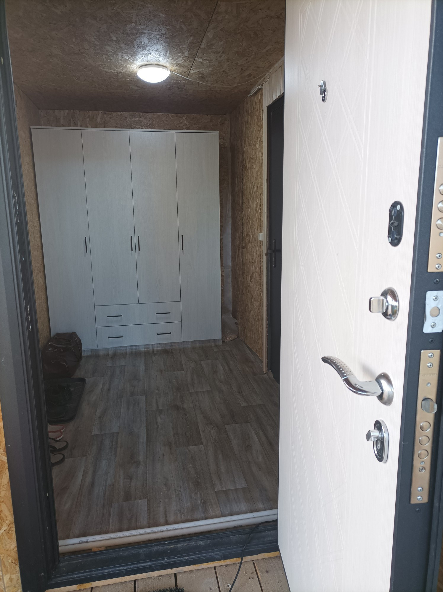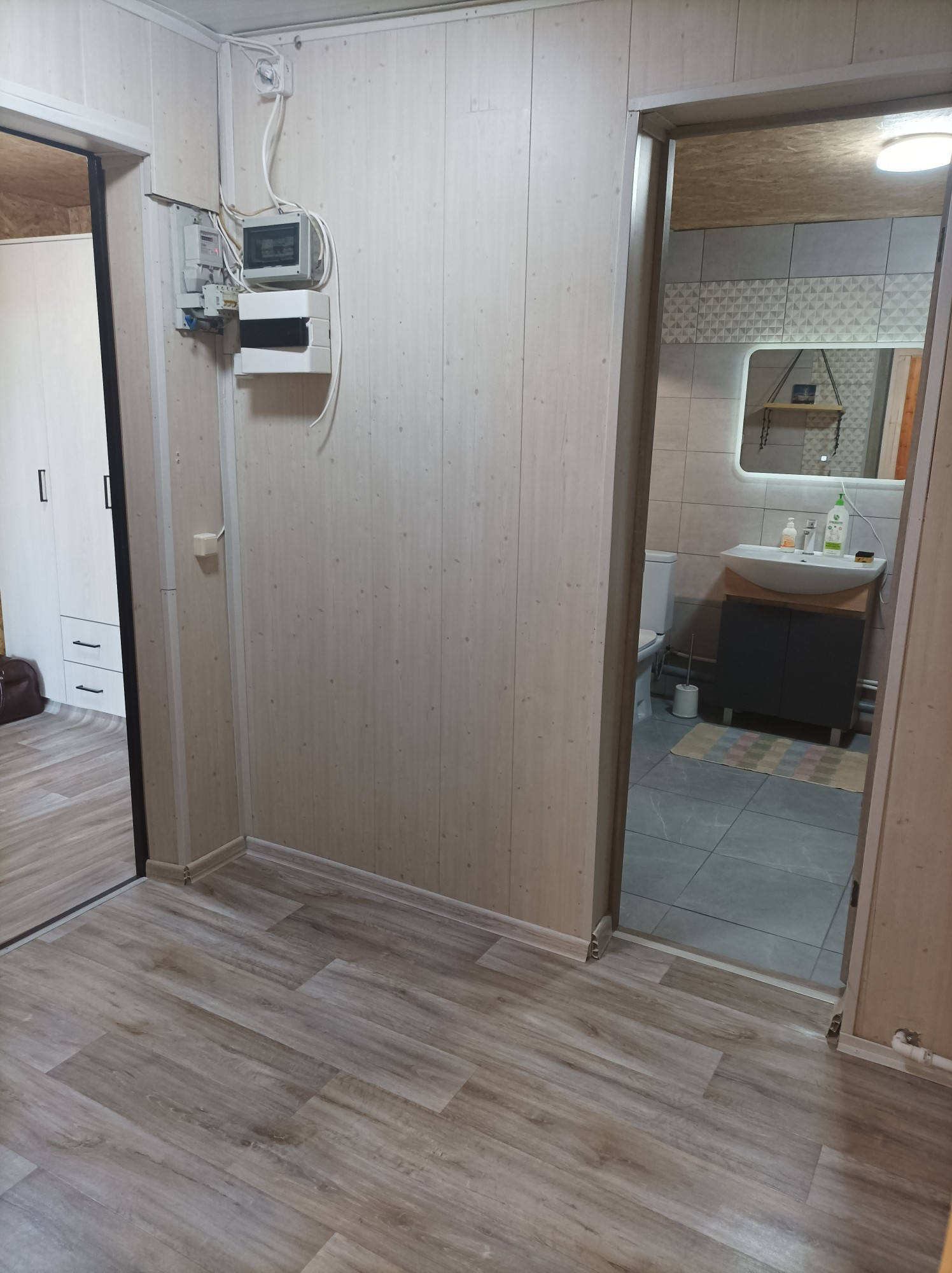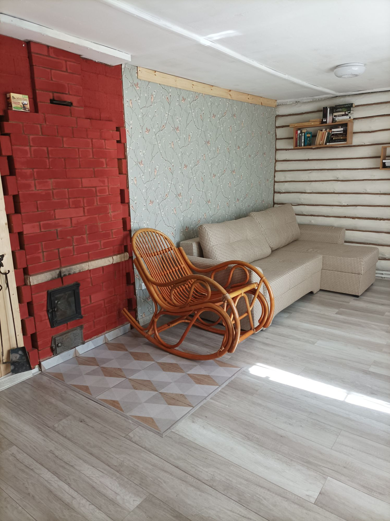 В маленькой комнате планировалось разместить лестницу на 2й этаж. Второй этаж делать не начали. Дом абсолютно и совершенно подходит для круглогодичного проживания и за счёт второго этажа можно увеличить его площадь (добавить 2-3 комнаты, по желанию). Работа в Санкт-Петербурге внезапно закончилась и новую предложили только в другом регионе, поэтому, в связи с переездом, не успели доделать облицовку дома качественным декоративным материалом, но он остаётся новым владельцам. И стройматериалы для бани или др. тоже остались.