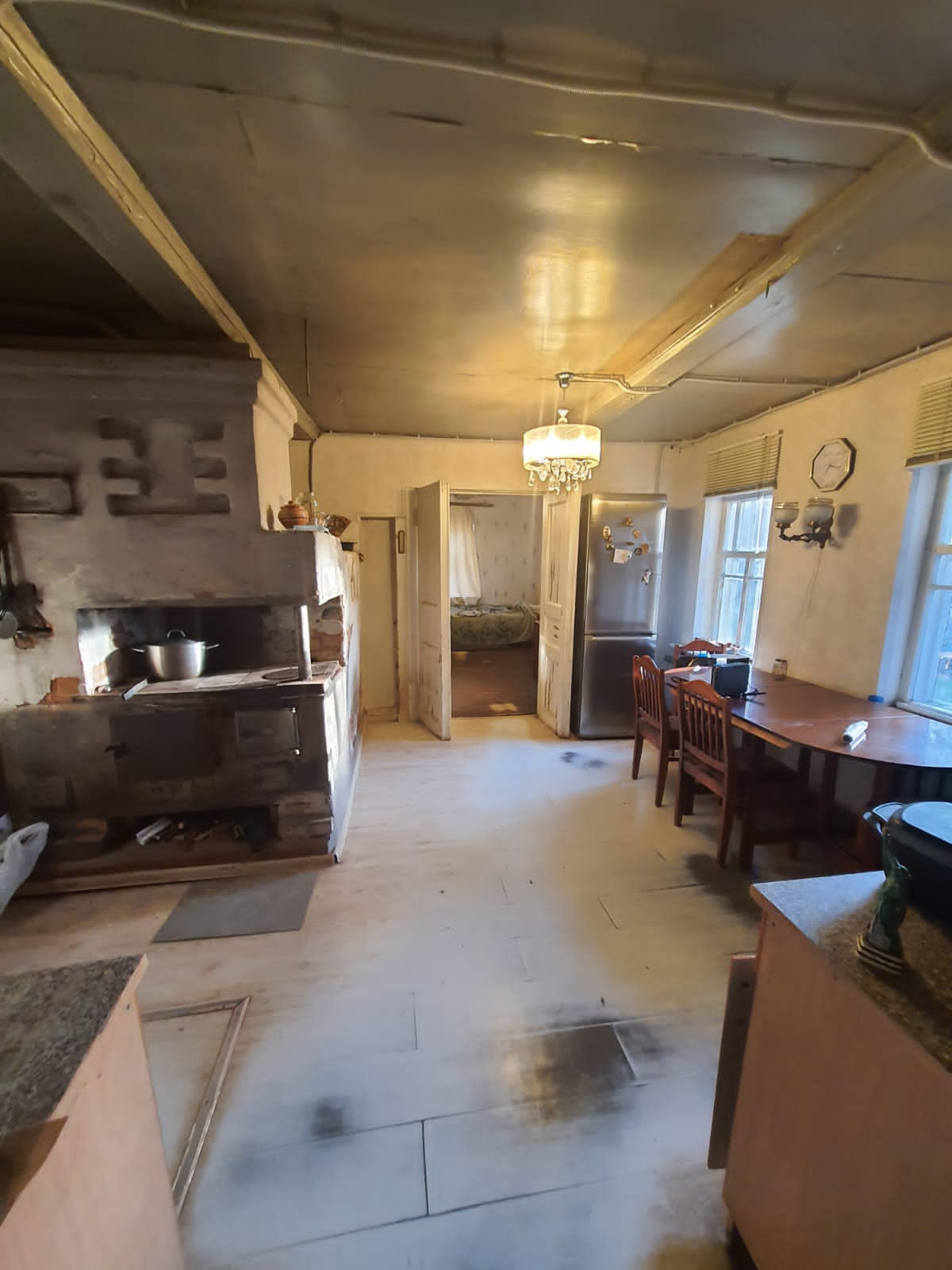 Отопление - твёрдотопливный котёл плюс русская печка, отапливающая две комнаты.
