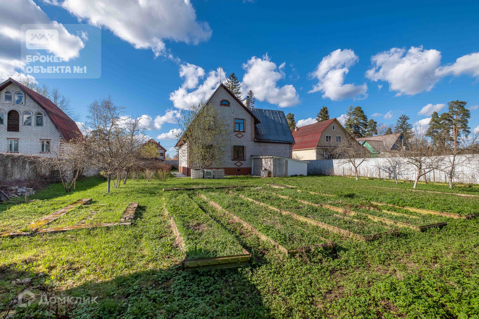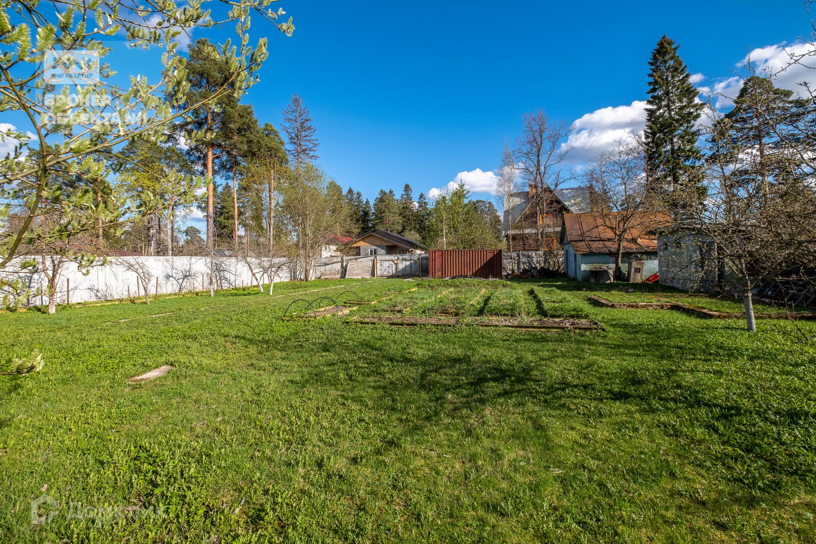 Участок разработан, растут плодородные деревья: яблони, груши, вишня и кусты смородины, малины.