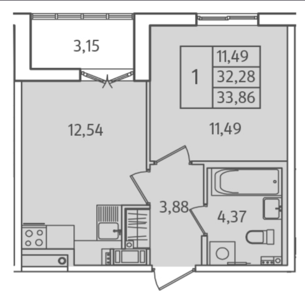 Общая площадь 33.86 м2