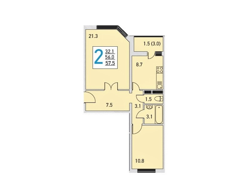 Общая площадь 57.5 м2